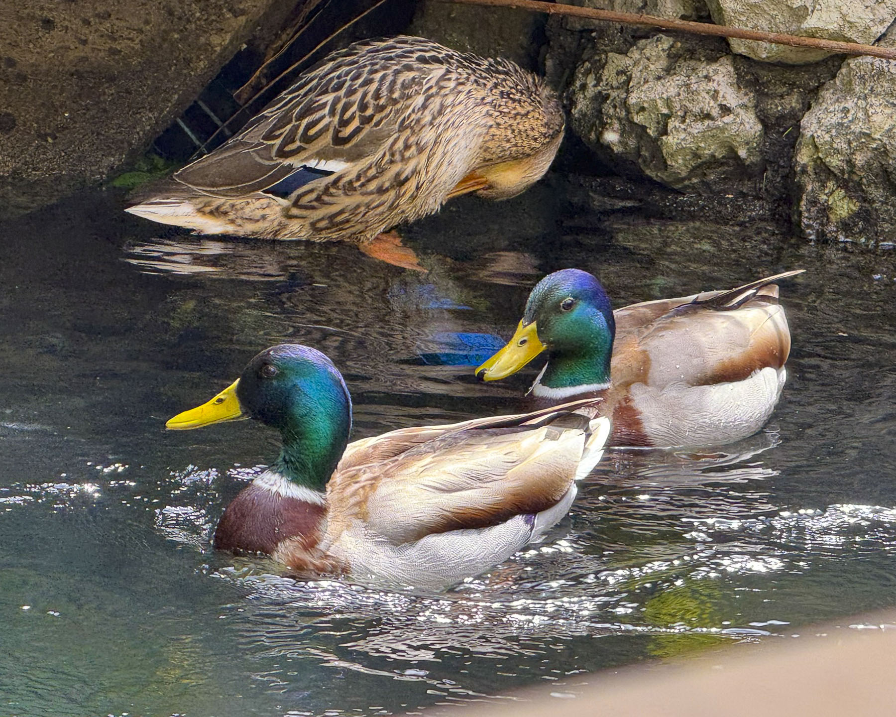 Strolling against the current of walkers we crossed a bridge to Josselin’s Quartier Sainte-Croix and wandered along narrow lanes past ancient half-timbered buildings dating from the early 16th century. Some leaned precariously, like an elderly person requiring a cane, while others featured ornamental heads carved into exposed roof rafters for decoration. Following our philosophy of “walk a little, then café,” we enjoyed a rest at the Logis Hôtel du Château, and its location on the riverbank.