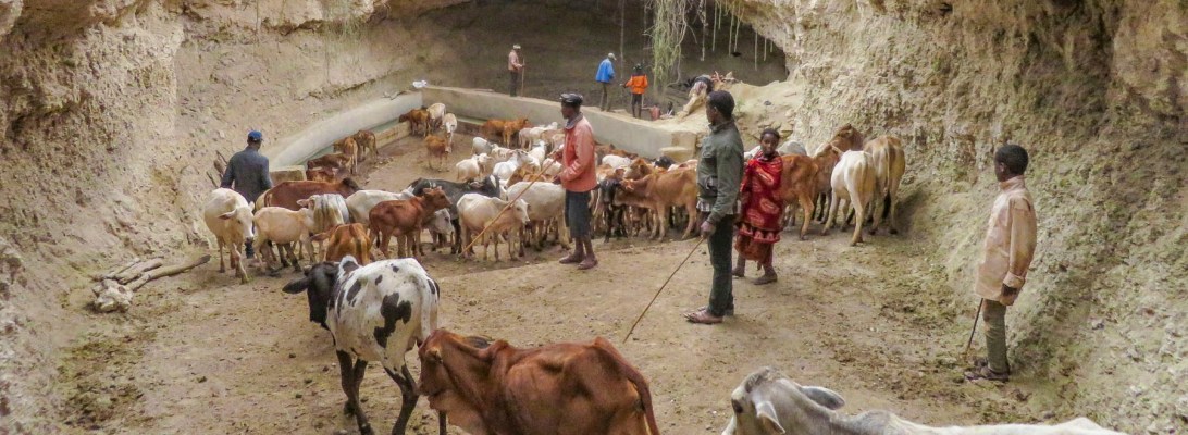 We trailed a young Borena girl herding a small group of cattle down a slowly inclined, dusty trench deeper into the earth. It was impossible to avoid cow patties as we steered clear of an exiting herd. Thirty feet below the surface, the trench ended in a bowl shape with a water trough where cattle were drinking. Rhythmic voices emerged from a shallow cave behind the trough. Climbing worn stone steps, we came to a narrow landing above the trough,