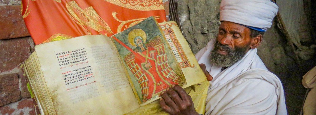 In the learning area, layers of carpet attempted to smooth an uneven, rocky floor where the novitiates sit to learn the ways of the orthodox church. In the corner rested several large ceremonial drums used during worship services. Picking one up our guide beat out a rhythm that would normally accompany liturgical chanting, or Zema, by the young monks. We’ve noticed that the treasures of the Ethiopian churches are not determined by their monetary value and locked securely away, only to be used on religious holidays, but by their spiritual connection. Precious, irreplaceable, ancient bibles and manuscripts, lovingly worn and torn as they are, continue to be used every day, as they have been for the last nine-hundred-years.