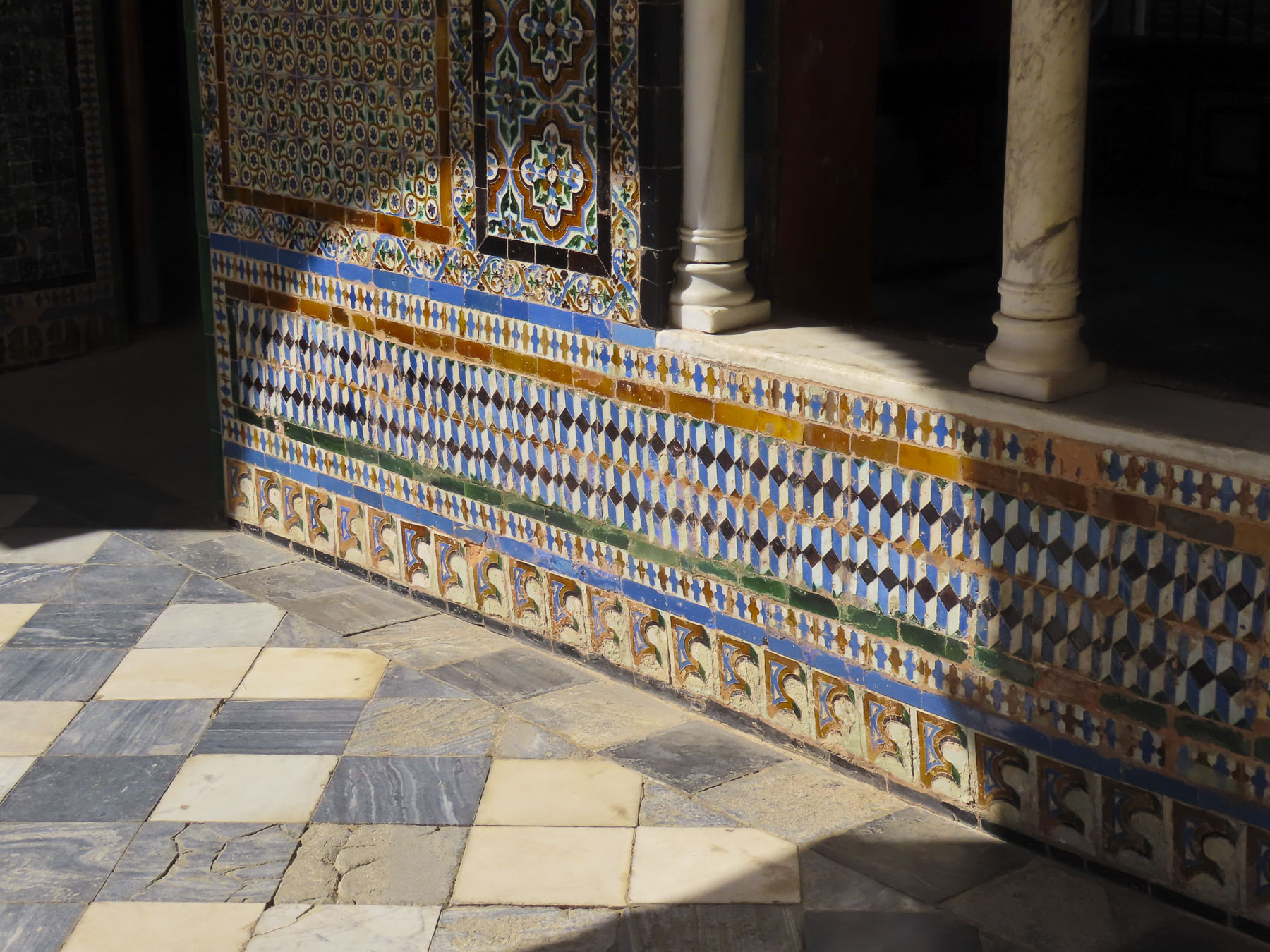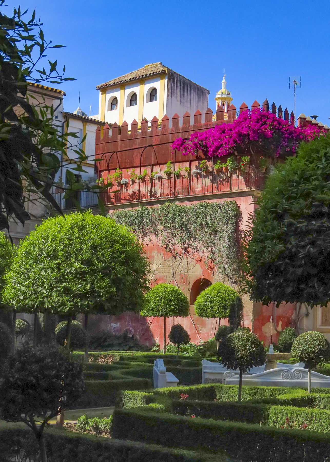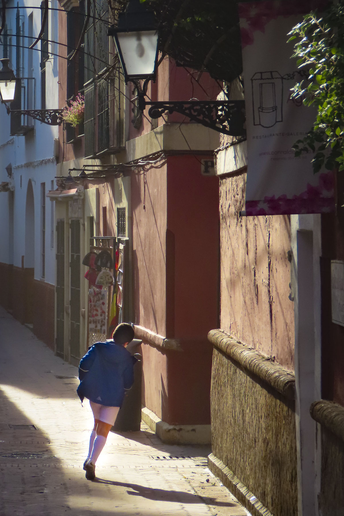 Roughly following the ring road, we would zig and zag our way through the old neighborhoods of the city that were once shielded behind its ancient wall. Starting in the old Jewish quarter, now Santa Cruz, we followed the wall topped with an aqueduct along Calle Aqua and peered through locked gates, spying the lush shaded courtyards of the traditional homes. Buildings along this calle that back to the Jardines de Murillo use the old defensive wall as part of their structure. Veering into the center of the old Juderia we found some of the narrowest lanes in Seville. The thinnest being Calle Reinoso which leads off Plaza Venerables and is affectionately nicknamed “Calle de los Besos,” the Street of Kisses to visualize how intimate the passageway potentially can be.