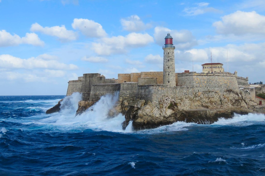 Our ship listed heavily as gale force winds churned the sea as we left the shelter of the harbor and passed the solid stone walls of the Castillo De Los Tres Reyes Del Morro.