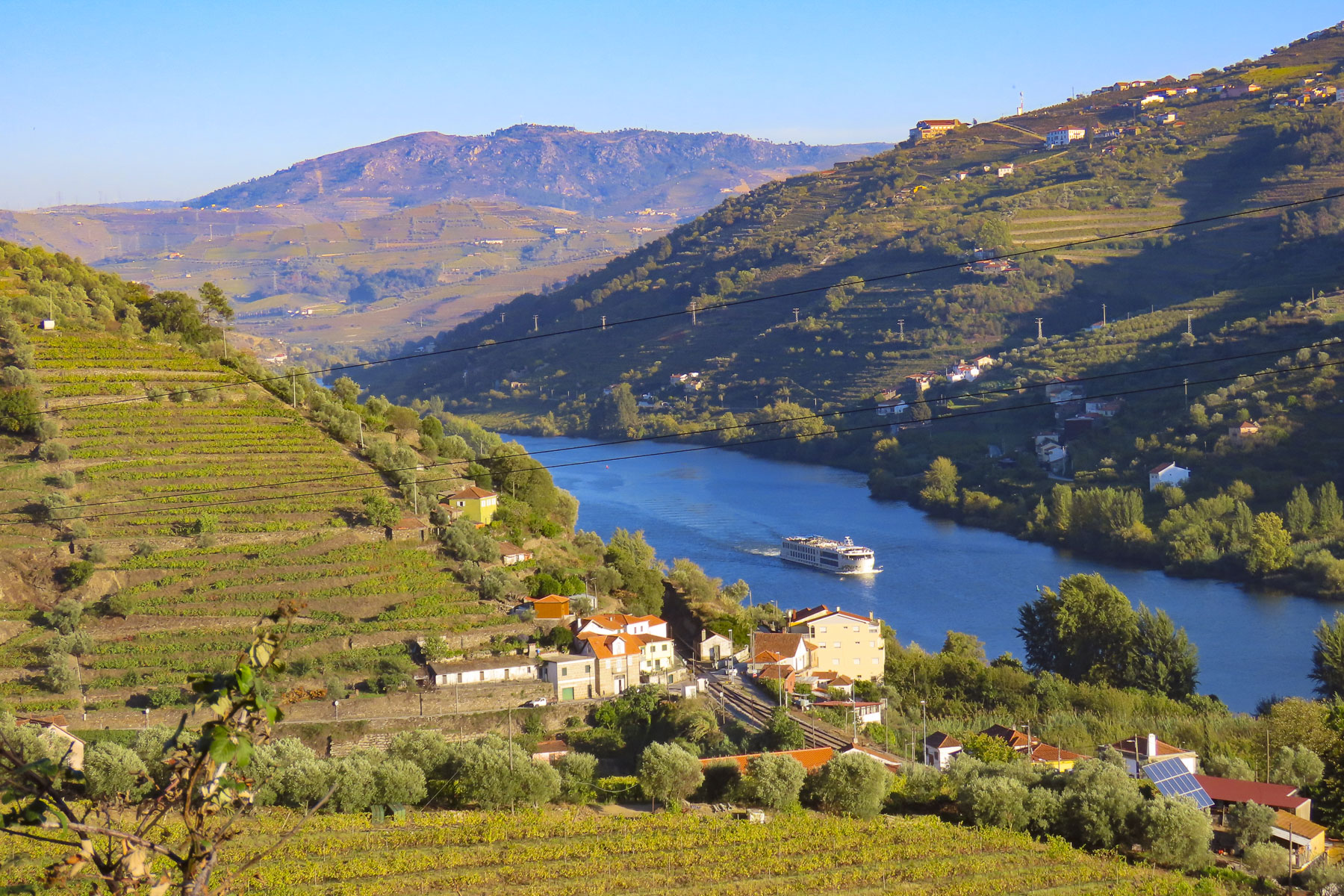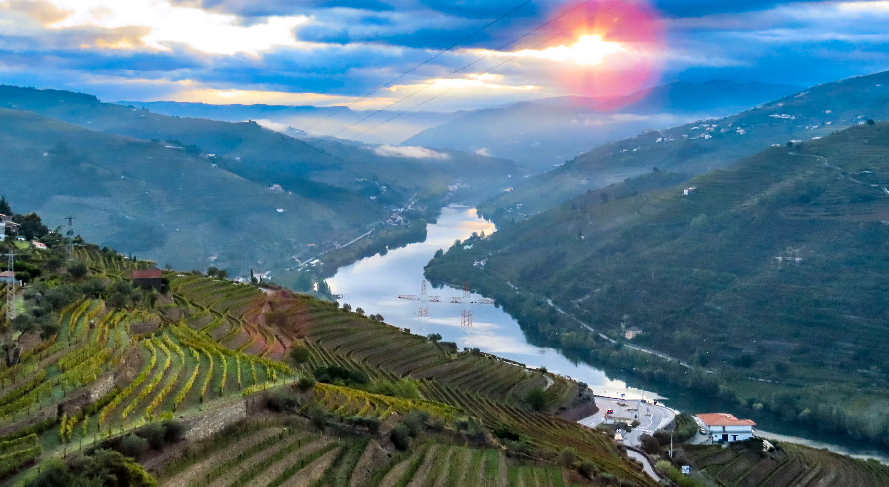 The waters of the Douro River rise in the mountains of central Spain, north of Madrid and flow of west for 557 miles before meeting the pounding waves of the Atlantic Ocean on the Portuguese coast at Porto. The famous region known for its production of Port, a fortified wine, encompasses 615,000 acres along 75 miles of river valley from the Spanish border to Mesão Frio.