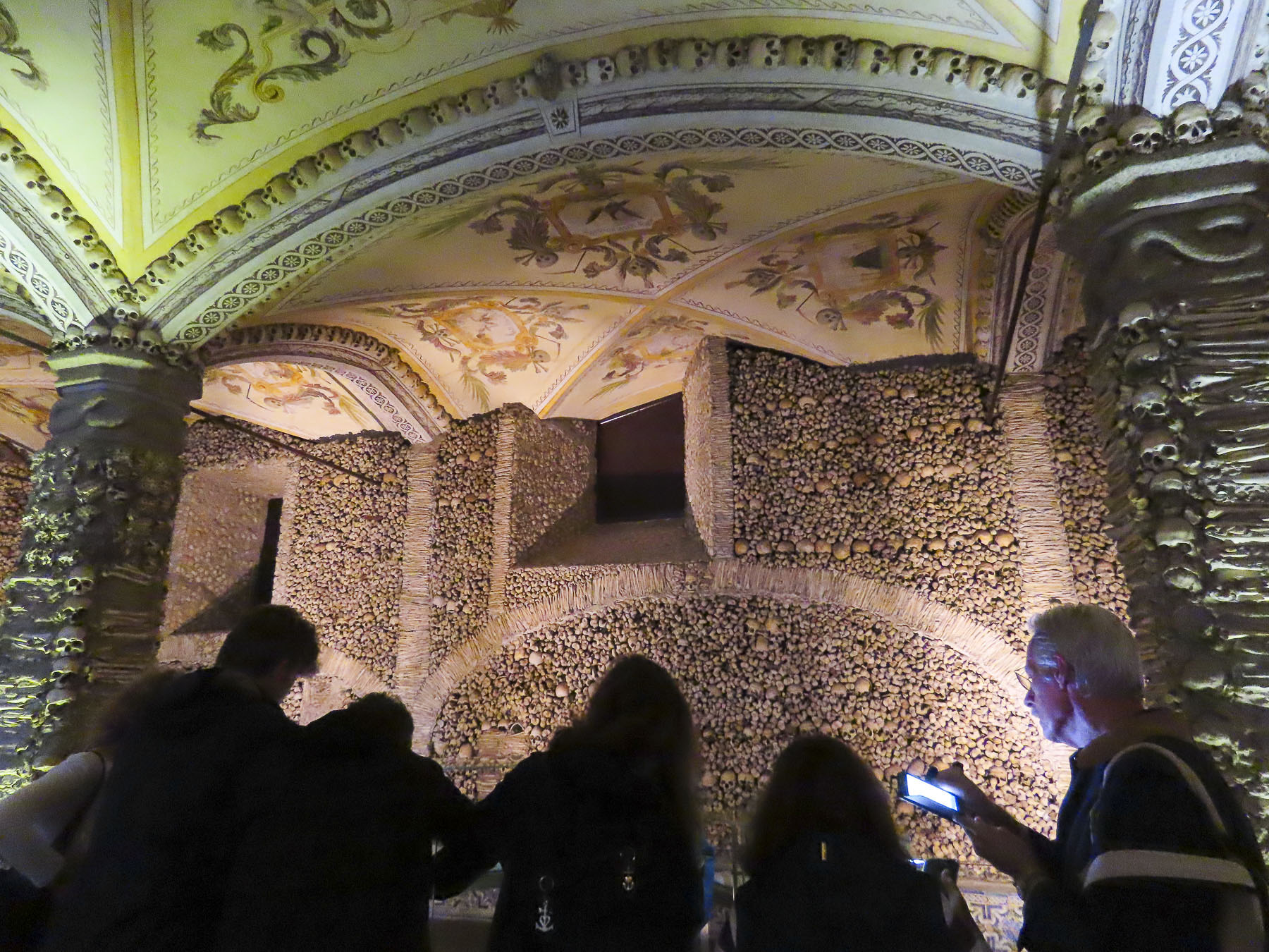 “Nos ossos que aqui estamos pelos vossos esperamos.” It’s hoped this odd welcoming inscription, translated as “We bones that are here, for your bones we wait,” above the entrance to the ossuary will lead visitors to contemplate the ephemeral nature of life. Attached to the Mosteiro de São Francisco, the bones chapel was built by three Franciscan monks in the late 1400s as a way to respectfully reintern 5000 dead that were being exhumed from Evora’s overflowing cemeteries to make room for the newly departed. A wedding service was in progress at the Iglesia de São Francisco when we exited. Something old, something new. Life goes on.