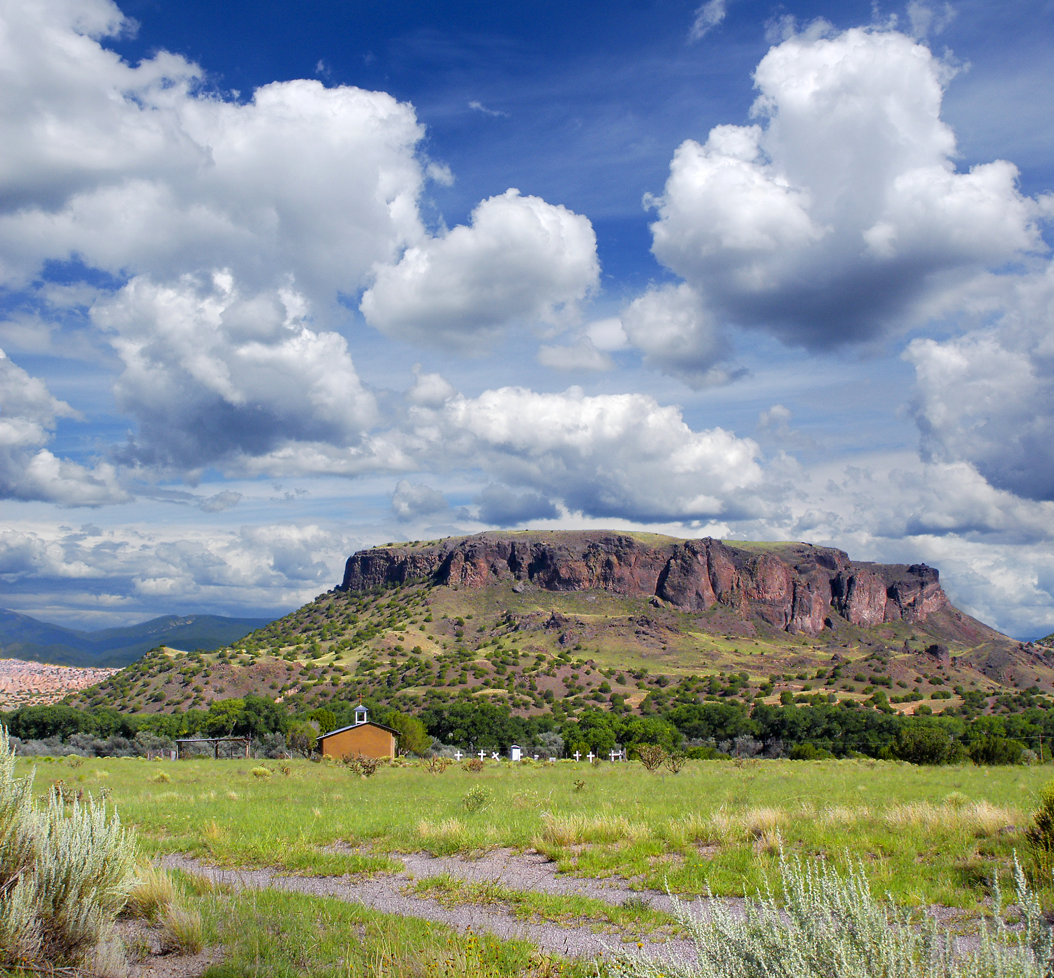 The landscapes north of Santa Fe continue to be intriguing, with Black Mesa, sacred to Native Americans, and the Puye Cliff Dwellings which run along the base of a mesa for over a mile. Stairs and paths cut into the cliff face led to adobe structures atop the mesa’s plateau. East of Espanola, the Santuario de Chimayo, built in 1816, still attracts pilgrims seeking miraculous cures from its “healing dirt.”