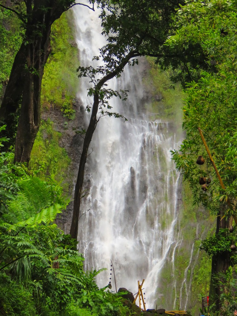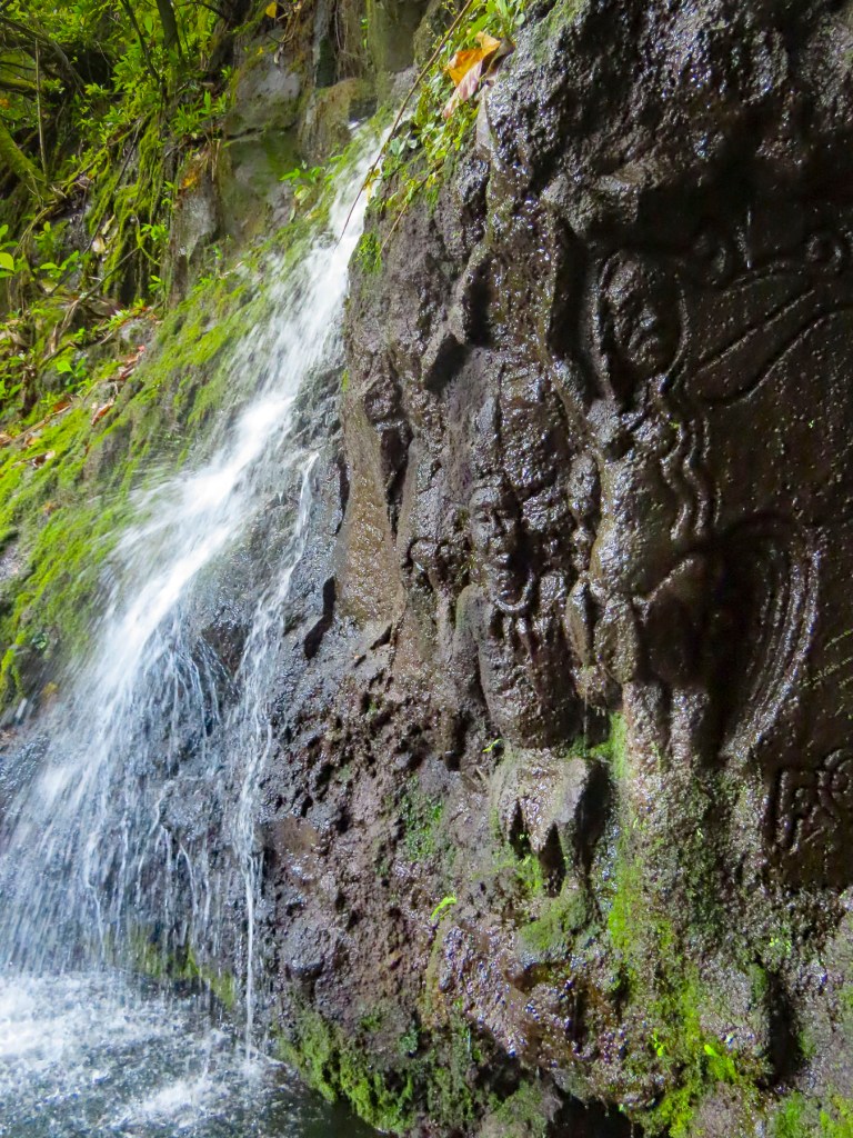 Closer to Tahiti Iti, La Cascade de Pape’ana’ana was a hidden gem barely visible from the road. It’s a mysterious site with figures of a tribal chief and a woman carved into the stone face of a small waterfall. No one knows when or who created it. There were numerous waterfalls and beaches along the east coast of Tahiti Nui just waiting to be explored.