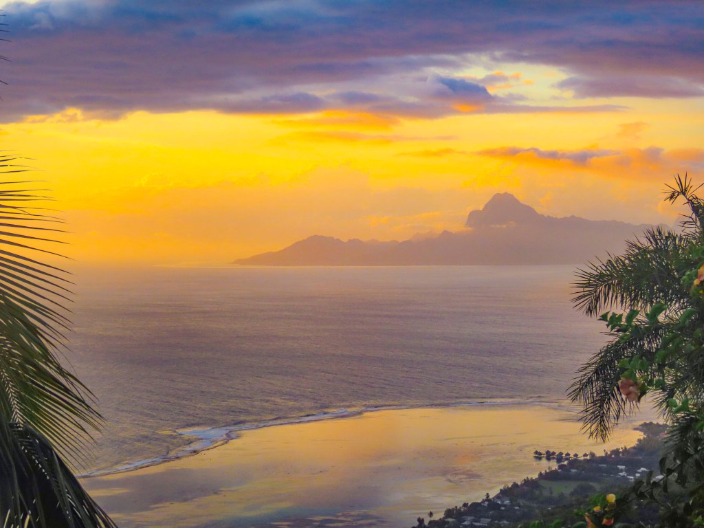 This construction gave it a splendid Robin Crusoe treehouse feel. It had a fully equipped outdoor kitchen, and porch and seating area boasted a view of Moorea in the distance. It was one of the nicest apartments we’ve every stayed in during our years of travel. Oh, and it had an avocado tree laden with fruit hanging over the entry stairs. We didn’t want to leave!