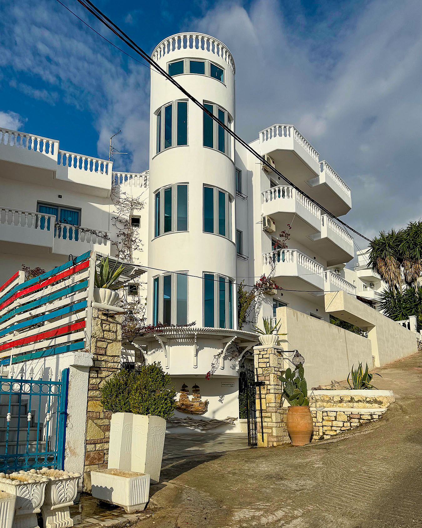 Clearing skies greeted our late afternoon arrival at the Harmony Hotel in Saranda. While the freedom a rental car offers during the day is fantastic, the rental often becomes an expensive ball and chain when considering overnight parking options.Fortunately, during the mid-April shoulder season, the Harmony Hotel had plenty of parking right out front on a street that was as steep as those in San Francisco. Concerned that if the parking brake ever failed the car would roll downhill into the Adriatic, I curbed the wheels, a concern the receptionist thought was unwarranted. The local folks never curb their wheels, and no cars have rolled away to a watery grave. Still. The hotel is run by a wonderfully enthusiastic and friendly extended family that exudes hospitality. The sister-in-law guided us upstairs and down a freshly painted hallway, touching the walls every so often to make sure the paint had dried, to a crisp, all white room, with a balcony and a distant view of Corfu, Greece, on the horizon. It was the perfect romantic spot for two nights.