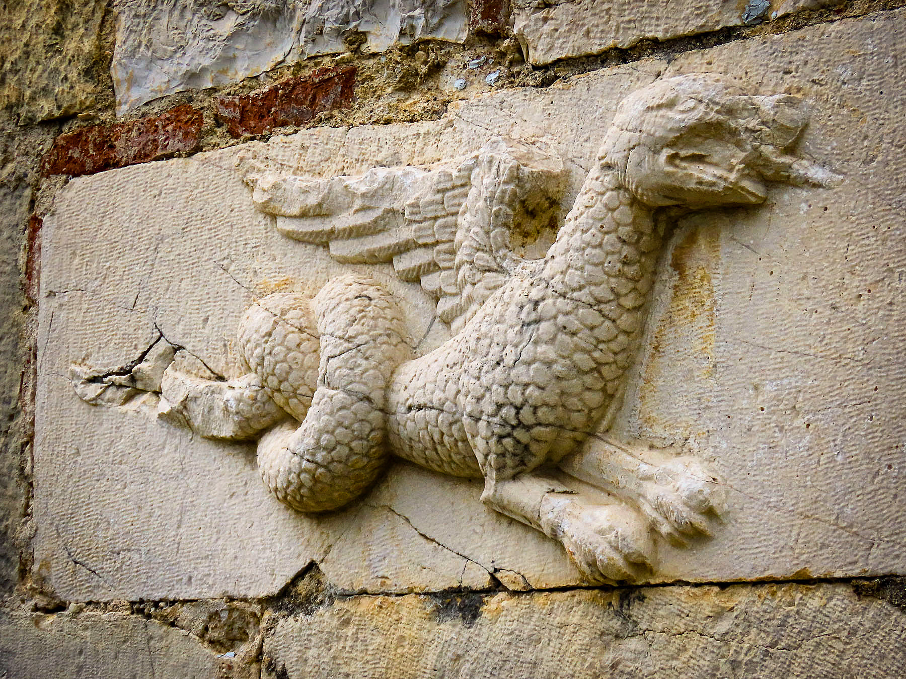 Carved stone relief sculptures on outside walls of serpent dragons with their twisting tails tied in knots, as well as a lion, are attributed to the church’s ancient Greek builders.
