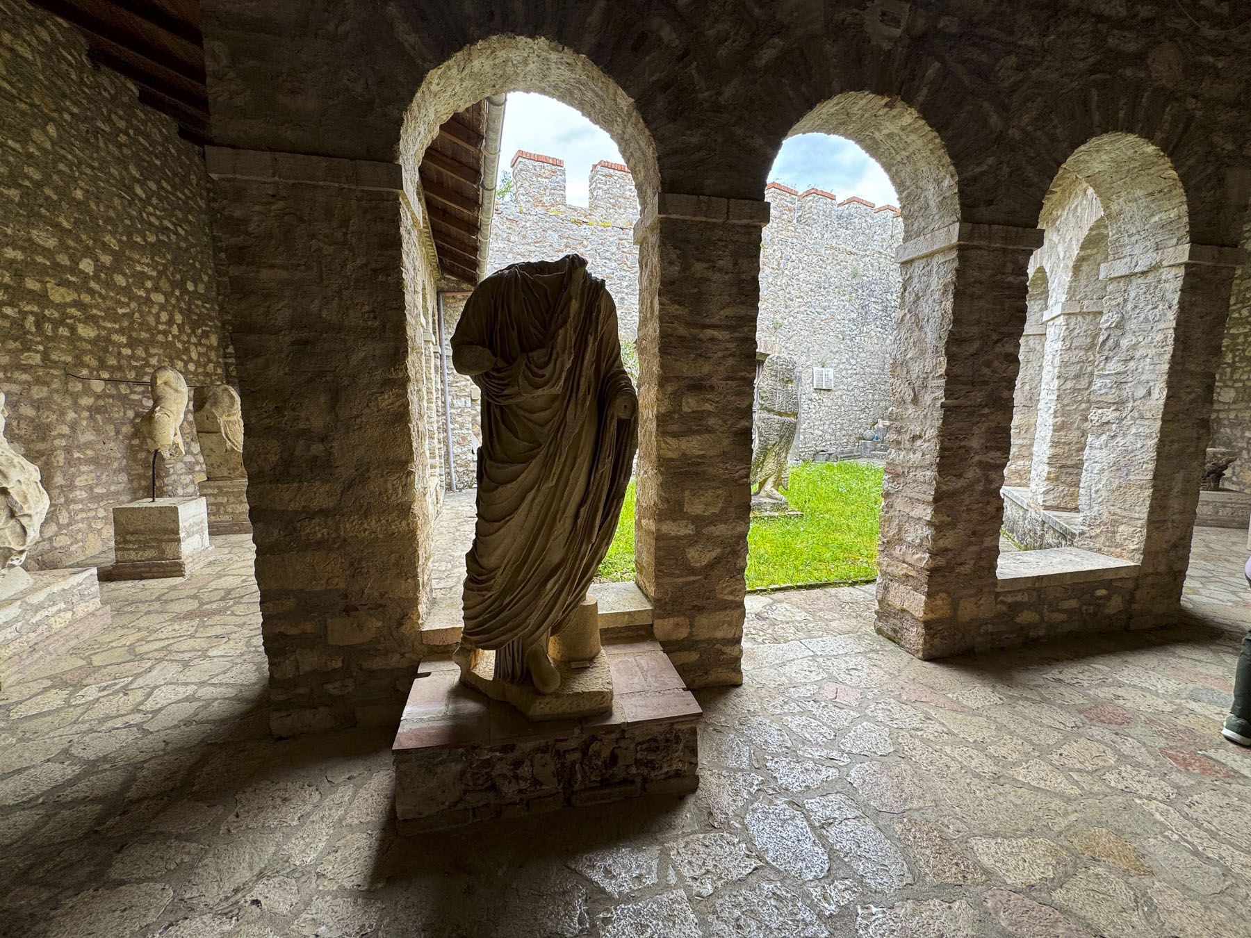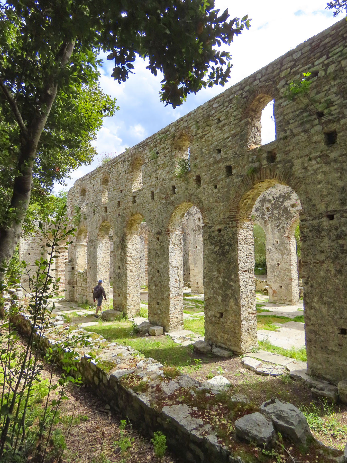 After the Greeks, the Julius Caesar arrived in 48 BC and called the city Bouthrotos. I can imagine Caesar atop the hill standing next to Pliny the Architect and asking, “Pliny, what can you do with all of this Greek rubble?” Emperor Augustus renamed the city Colonia Augusta Buthrotumhe. The city thrived under several centuries of Roman rule, its coffers full from trade with the Western Roman and Byzantine Empires. It was during this period of prosperity that a bridge and aqueduct across the Vivari Channel were built. The aqueduct, a testament to Roman engineering, spanned the waterway and continued to a fresh water, mountain spring four miles to the east. Many substantial buildings include a Forum, Roman Baths with heated water, Capitolium, a Gymnasium complex, and a circular Baptistery with a splendid mosaic floor. The floor is covered with sand to preserve it, but it is occasionally revealed for several days each year. Temples dedicated to mythological gods were eventually replaced with a Christian Basilica. Villas of the wealthy dotted the lake shore.