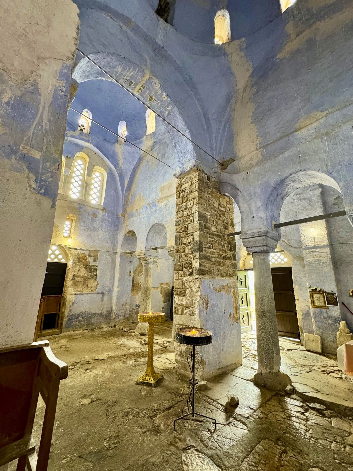 Built in 1224, above a 3rd century BC Greek temple, the church incorporated some of the ancient structure’s still-standing walls in a unique twin apse design, that accommodated Orthodox and Catholic religious services. Light cascading through pigeonhole venting high up on the exterior walls illuminated the interior and gave the wall’s ancient blue paint an ethereal patina. Sadly, the blue paint was applied over original frescoes during the Ottoman era when the church was converted to a mosque and human figures were no longer allowed in religious sites.
