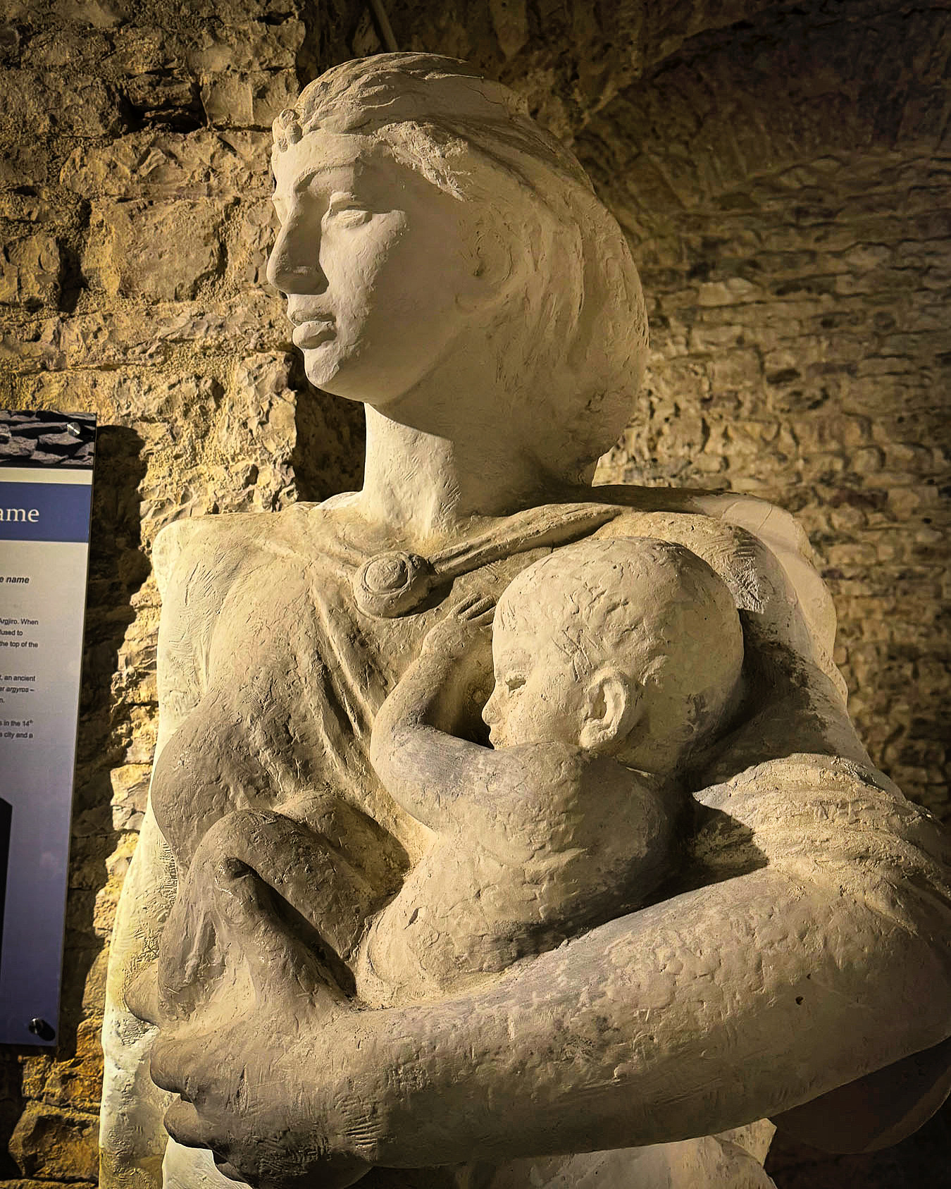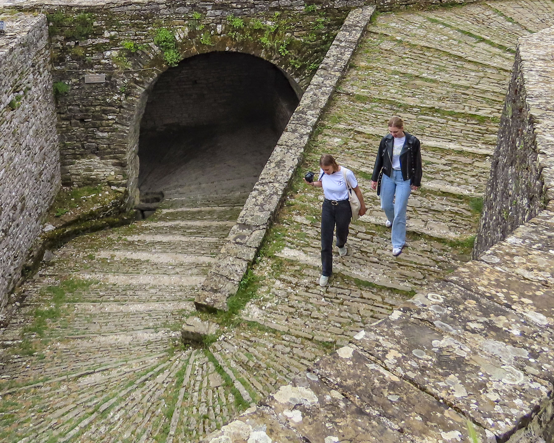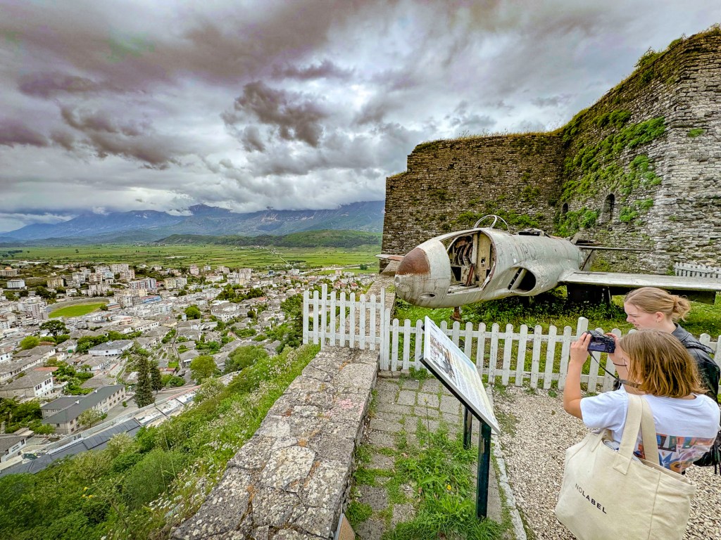 We were able to find parking on the street near the castle’s entrance, just after the site opened. Unfortunately, we were in the ticket queue behind a large student group on a school outing. But the line went quickly, and the students soon vanished into the cavernous lower level. Its high arched ceiling resembled the interior of a medieval cathedral more than any fortress we’ve toured previously. This was the ancient storeroom, barracks, and stable area. Today the open undercroft is used to display a collection of antiquated artillery pieces, tanks, and antiaircraft guns, that have been used in the conflicts of the past 200 years that have engulfed the country. Farther on there are rooms with exhibits about Albania’s complicated history over the centuries, the WWII resistance and folklore heroes. Especially moving was the tale of legendary Princess Argjiro, who, with her young son in her arms, is believed to have jumped from the castle wall to their deaths, to avoid imminent capture by the Ottomans.
