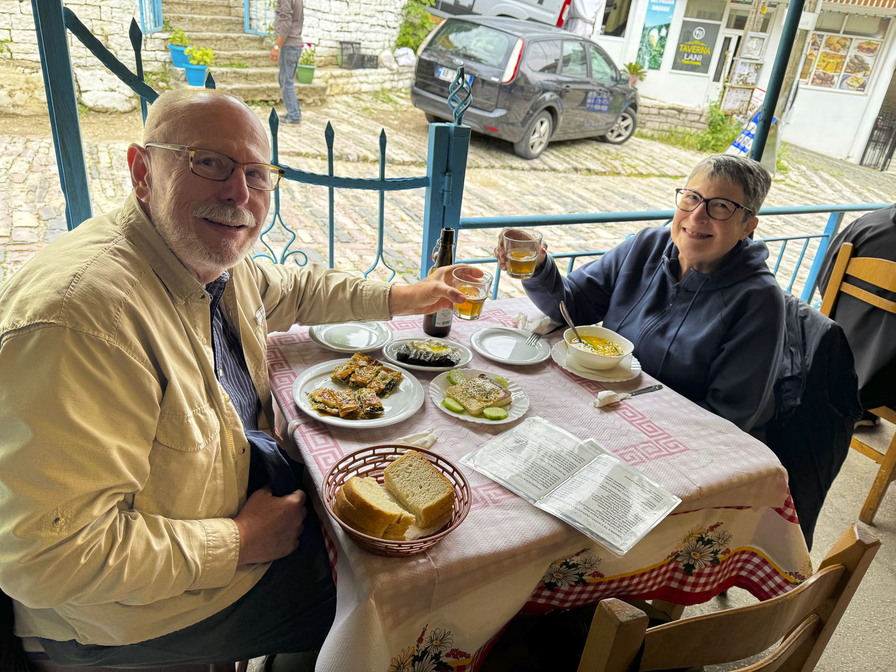 I’m hard of hearing, but Donna is a very light sleeper, and we inquired about a room change to avoid the loud students, only to be told the hotel was full. They graciously offered us a bottle of white wine and delicious orange peels soaked in honey for dessert, which we enjoyed in the restaurant until it quieted upstairs. Considering the price of our room, we are not sure if this was fair compensation for a poor night’s sleep. It was the third week of April, and overnight the rain had turned to snow on the higher elevations of the mountains around Gjirokaster. They brilliantly glistened in the morning sun. A week earlier, when we landed in Tirana, it was 80F for several days.