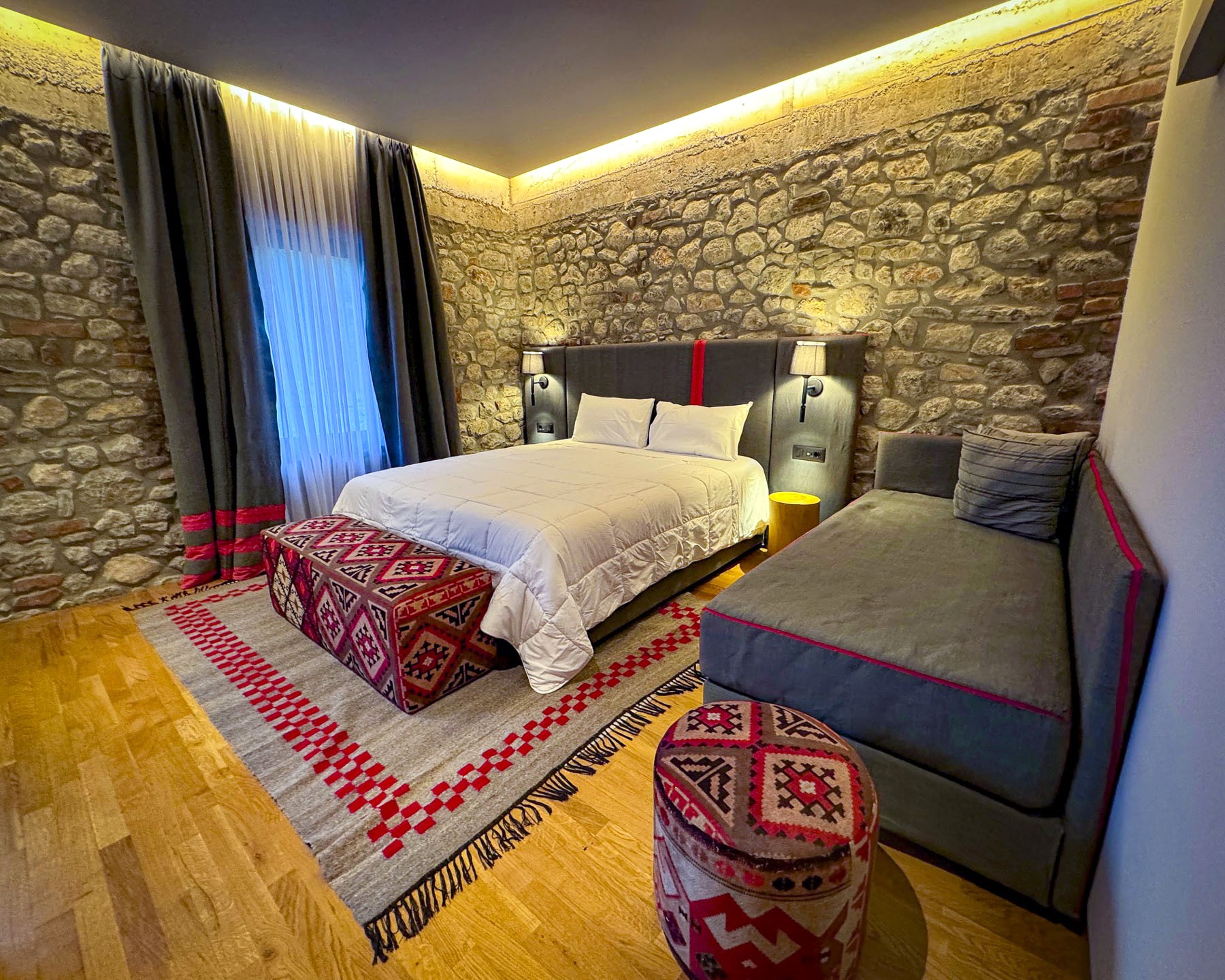 Under a stormy sky when we arrived, it was difficult to believe that the Ottomans established Leskovik as a summer resort for wealthy officials who owned estates in the region when it was under their control. Fortunately, we were pampered with a wonderful stay at the Melesin Distillery, truly a five-star boutique hotel in the wilderness of southern Albania. Its eight guest rooms upstairs are well designed, and nicely appointed with stylish furnishings, and great amenities.