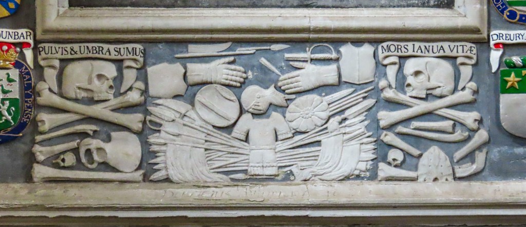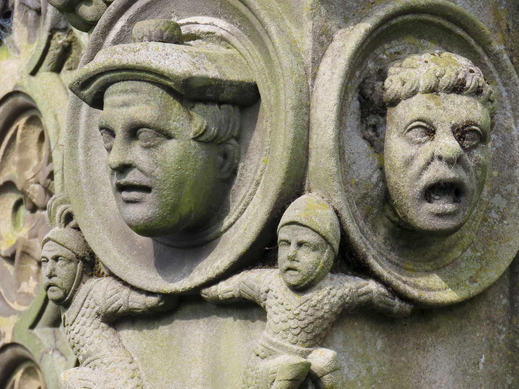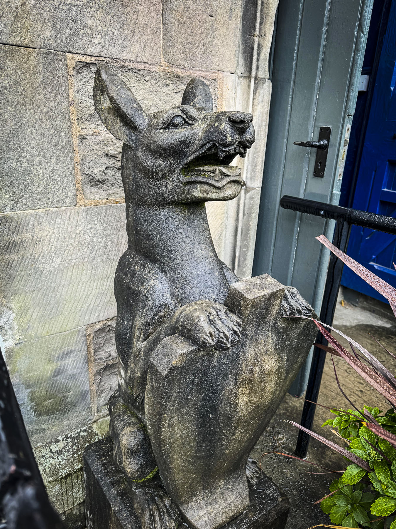 Afterwards we wandered the streets and alleys of Edinburgh’s ancient Old Town below the castle. The cheerfully painted storefronts along the bow of Victoria Street certainly brightened the day after a gloomy morning. The streets were busy with crowds gathered around entertainers performing in the squares. Eventually, we found our way to the Greyfriars Kirkyard Cemetery.