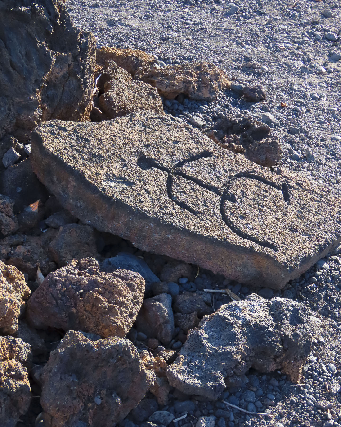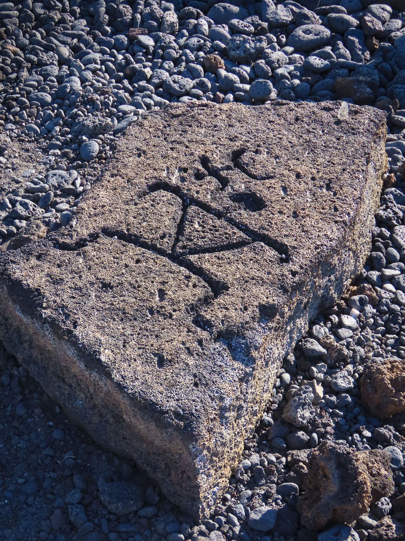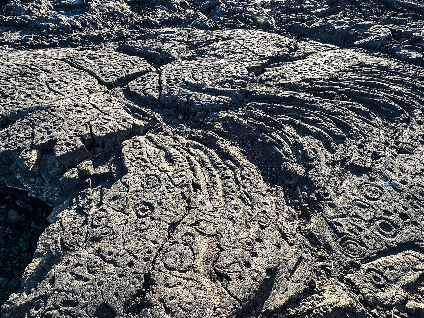 The next morning, we set out to find more ancient stone inscriptions at the Puakō Petroglyph Park, in nearby Waimea. The trail started in Holoholokai Beach Park, where there is a unique beach of black lava rocks mixed with white coral, and soon led to a gathering of petroglyphs.
