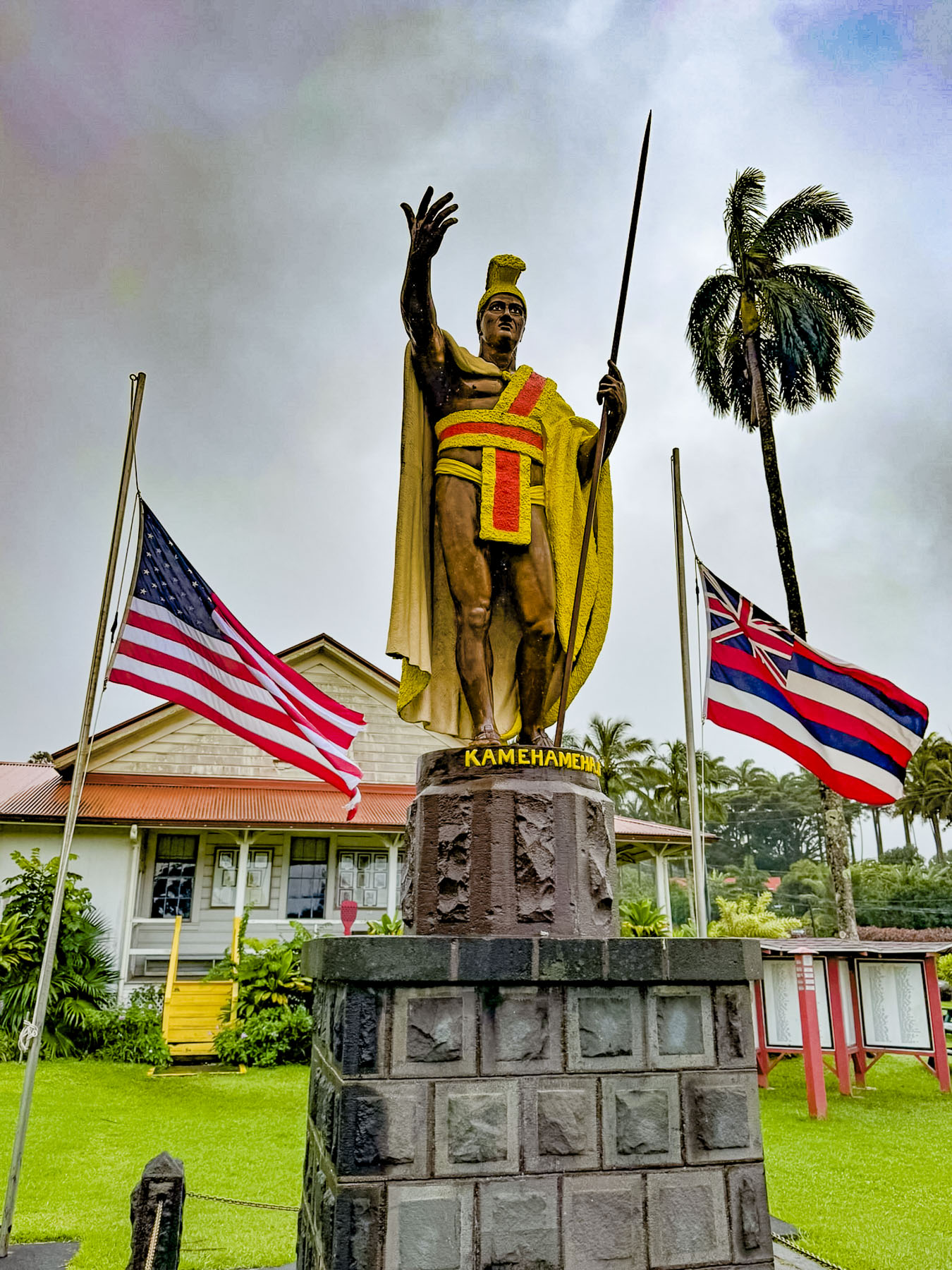 A few minutes farther up the road we stopped in Kapaau at the Statue of King Kamehameha that commands the slope in front of the Old Kohala Courthouse. Ancient Hawaiian legends had foretold, “a light in the sky with feathers like a bird would signal the birth of a great chief.” Halley’s comet passed over the isalnds in 1758, the year Hawaiians believe Kamehameha was born. For centuries warfare between clans and inter-island raids were widespread throughout the Hawaiian archipelago. Kamehameha with an army of warriors on hundreds of peleleu, double-hulled 70ft long war canoes, sailed between the islands. In a series of battles he defeated the opposing chiefs on Hawaii, Oahu, Maui, and Molokai and united the islands into the Kingdom of Hawaiʻi in 1795. By 1810 the islands of Lanai, Kauai, and Niihau voluntarily joined the kingdom.