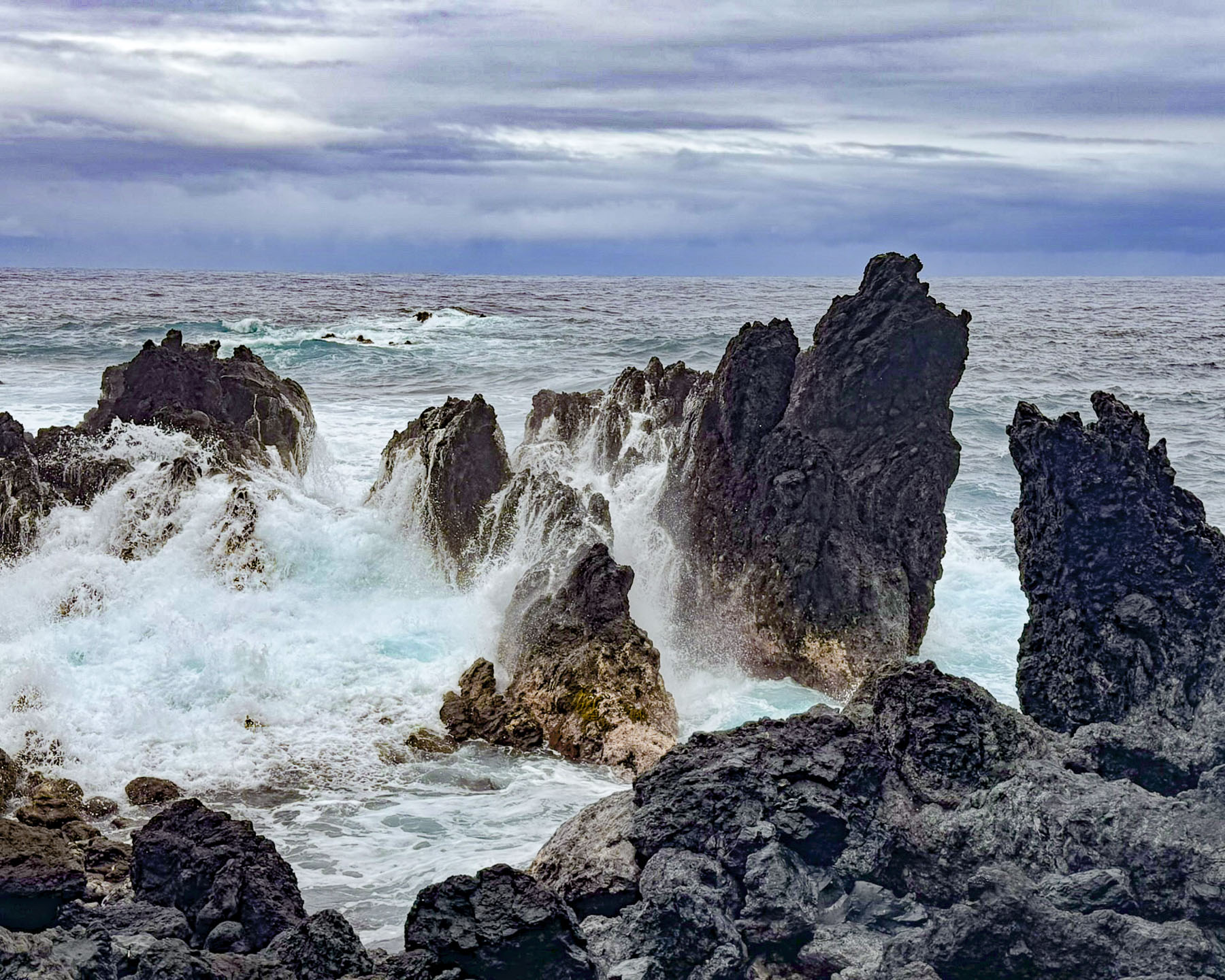 The overcast sky persisted as we drove down a twisting road through a rainforest to Laupāhoehoe Point. It’s a small, beautiful peninsula, with a rough lava rock coastline. The ocean swelled and crashed against the coast with a ferocity that the beaches on the west side of the island don’t experience, unless there’s a storm.