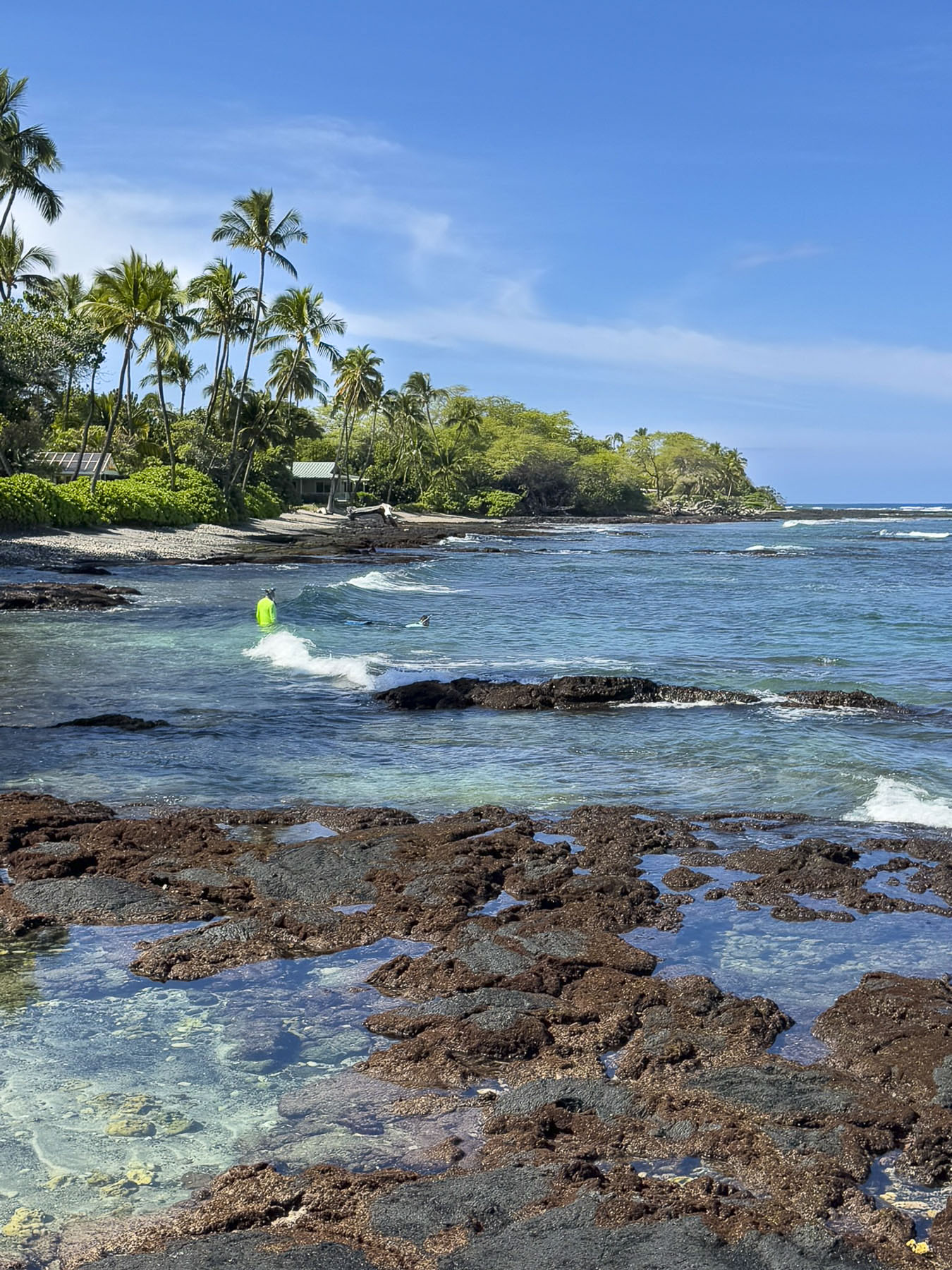 Puako Bay is a few minutes south of Hapuna Beach, the island’s largest stretch of sand, which we had visited earlier in the week. It’s a tranquil bay with many public access trails from the road to small sandy beaches, and rocky coves, that folks like to snorkel in.