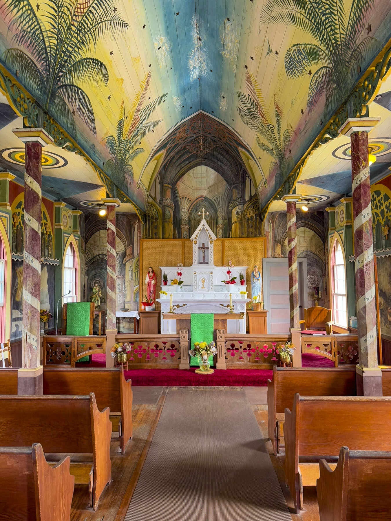 Uphill from Pu’uhonua O Honaunau we visited the Painted Church, aka St Benedict Catholic Church. It’s a simple wooden church that dates from the 1880’s, and easy enough to just drive by unless you know it has a spectacularly painted interior.