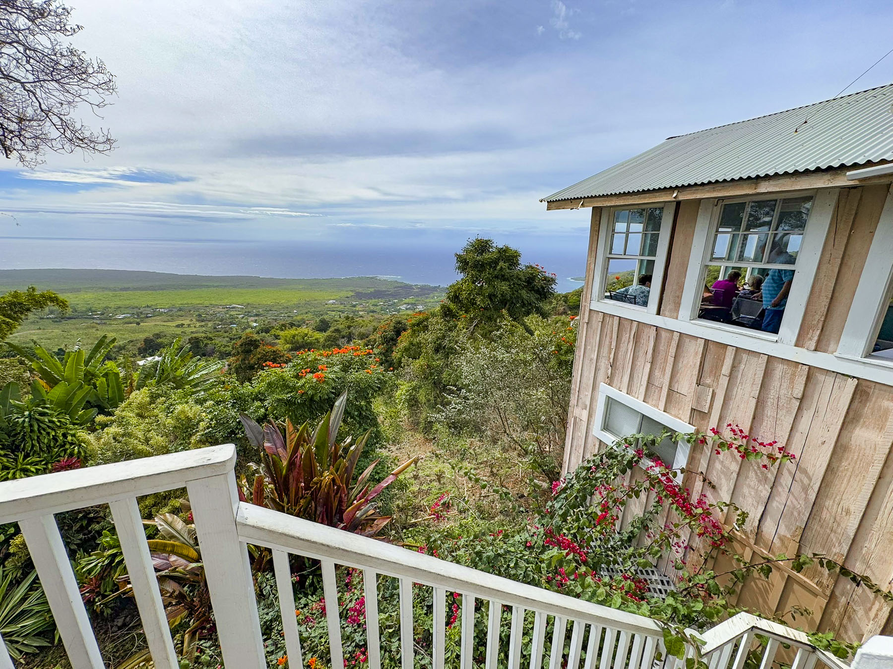 The Coffee Shack, a laidback breakfast and lunch restaurant on Rt11 in Honaunau-Napoopoo, was recommended to us as a nice place to eat. Parking was a little difficult in their small lot, and the place doesn’t look like much from the outside, but inside they have a lanai, an open sided porch, with panoramic views over the hills leading down to the Kona coast and Kealakekua Bay. We had just gotten seated when the power went out, something that we were told happens quite frequently across the island, and the server informed us “the cook doesn’t open the refrigerator when this happens, so we only have pastries, and the coffee is still hot.” It wasn’t much of a sacrifice to content ourselves with coffee and luscious pastry.