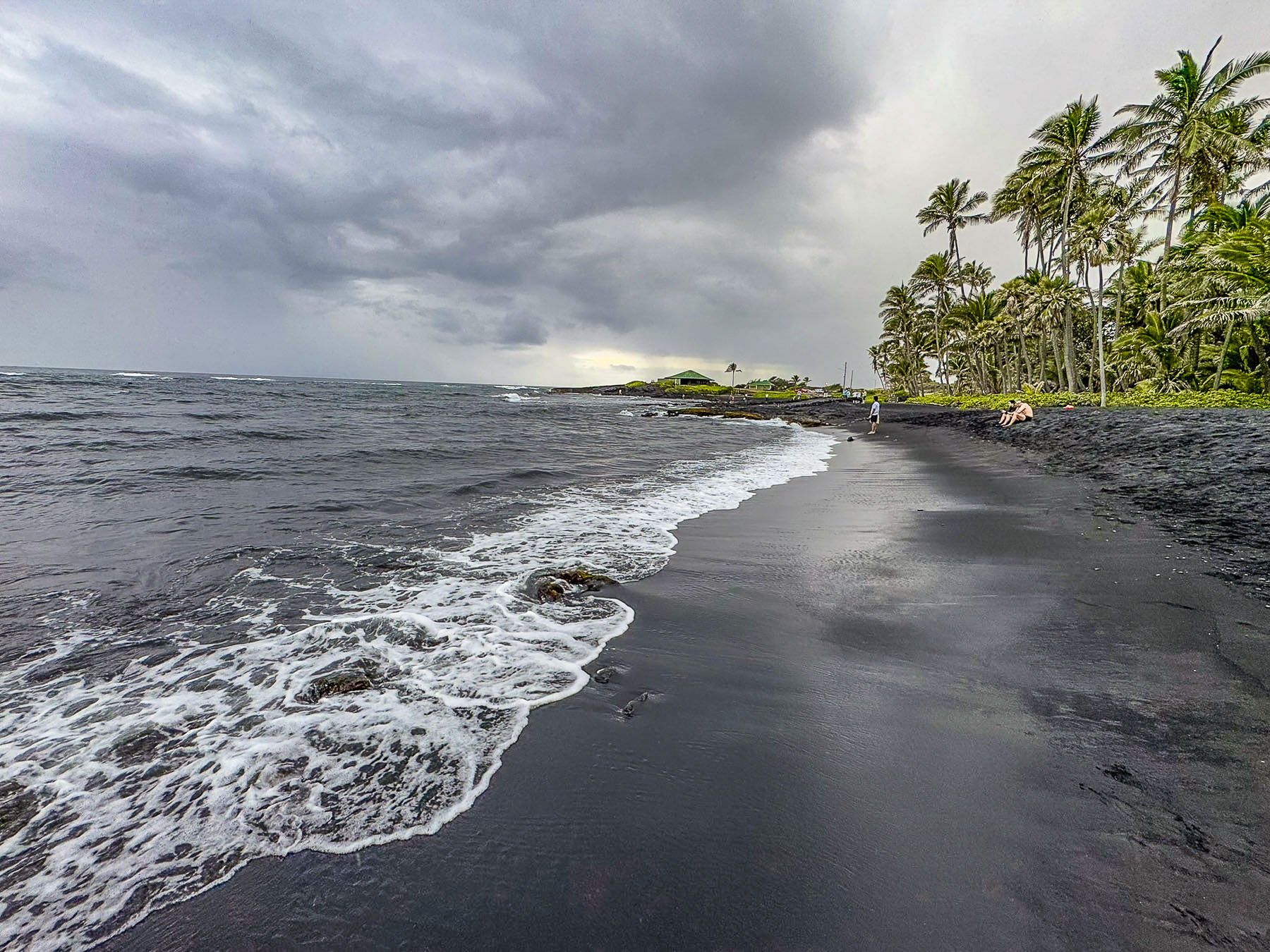The power outage also affected gas stations along our route. With the afternoon sky darkening we decided to forego visiting South Point and continue on to Punaluʻu Beach. It’s a graceful crescent shape, and we are sure on a sunny day its volcanic black sand beach lined with coconut palms would be stunning, but this afternoon it looked foreboding with a gray sea sweeping its shore, more apropos for the scene of a novel’s fictional shipwreck, than a place to sunbath.