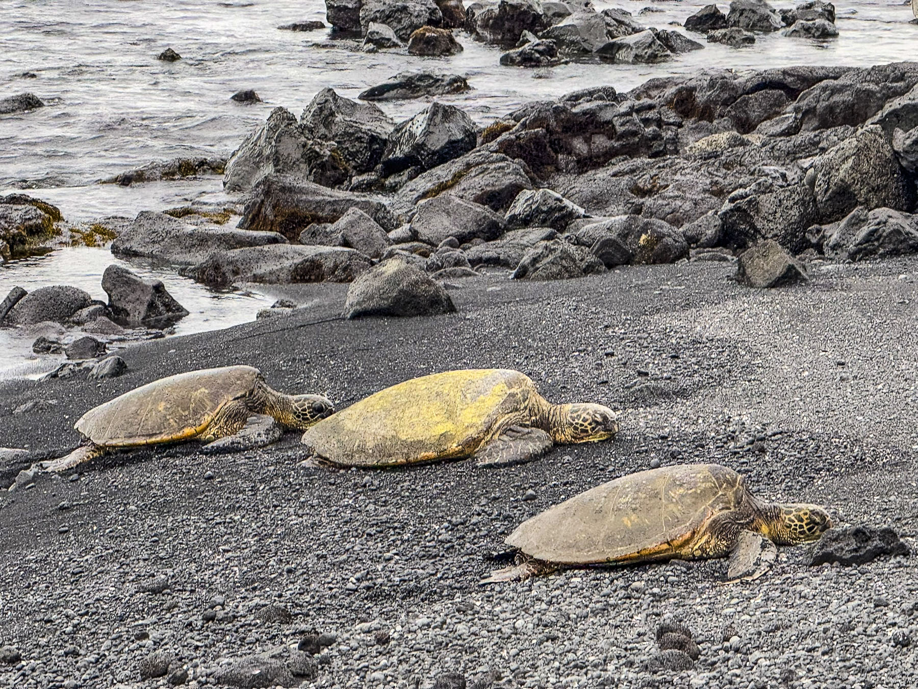 Rain was threatening now, but as we walked back to the car, Donna was waving excitedly to us. On the beach were three large green sea turtles in a roped off nesting area. Native to the Hawaiian archipelago, they are the largest sea turtle that nests on the islands and are symbols of good luck, wisdom, and protection. It was such a pleasure to see them.