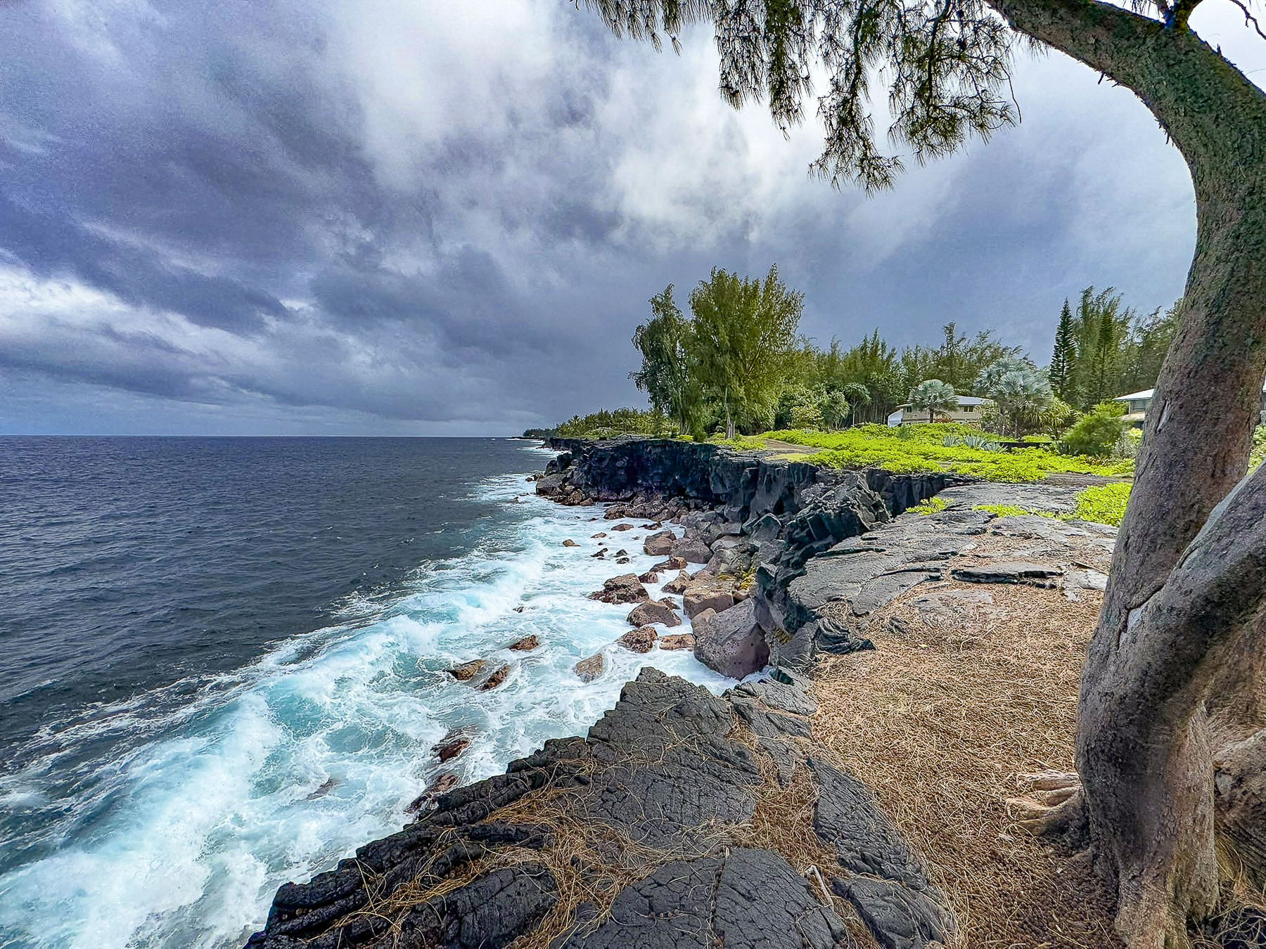 Turbulent seas churned from storms blowing across the Pacific along with volcanic activity have prevented the creation of beaches on eastern coast of the Big Island. Dramatic volcanic cliffs and lava outcroppings line the windward coastline instead.