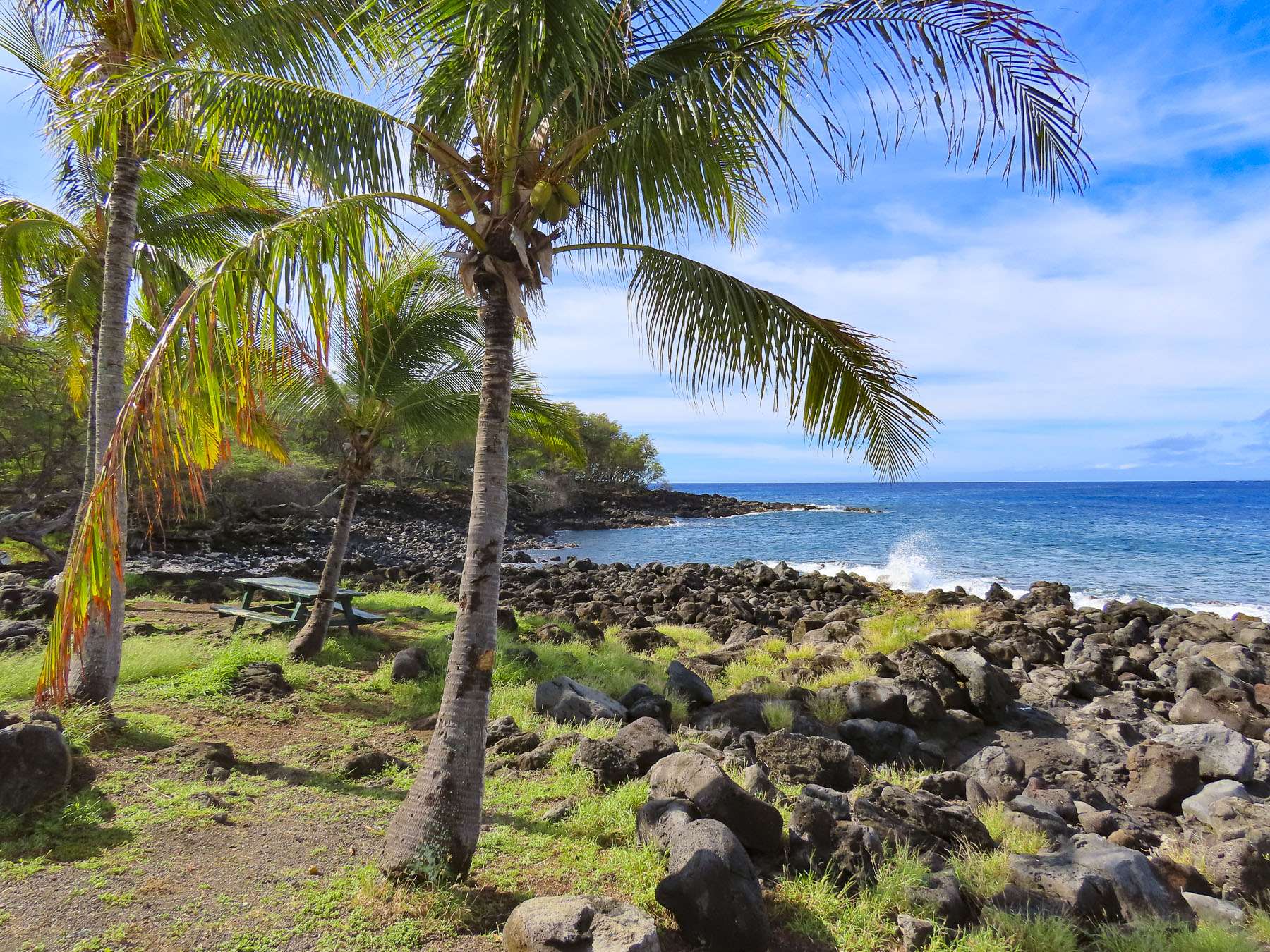 Kikaua Point Park was south of our resort and access to it was, surprisingly, through a gated community. Where folks are allowed access to the beach after getting a parking permit from the security guard. A long concrete walkway led from the parking lot through a boulder strewn lava field to a lovely palm treed beach. Folks were enjoying the breeze in the shade of the trees and swimming in the warm water of an almost completely circular and shallow sandy bottom cove. It was the perfect spot to spread our towels out and go for a swim.