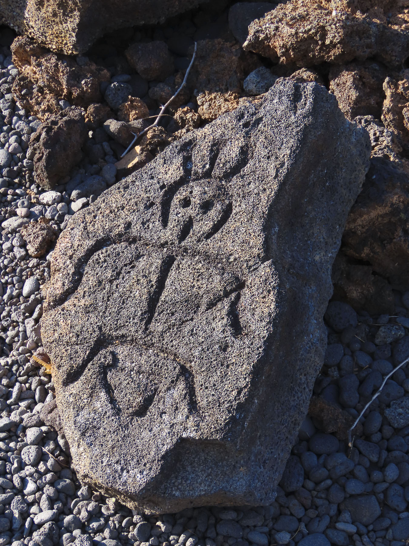 Continuing our loop around the resort we came upon the Kings Highway Foot Trail, part of the Ala Kahakai National Historic Trail, a 175-mile narrow footpath that follows an ancient trading and communications route, through rough lava beds. Starting at the farthest spot north on the island, Upolu Point, the trail which dates from the 1500s, connected the ancient Polynesian fishing villages and religious sites along the western and southern coast of Hawaii island to the farming villages in the highlands. In places like the Waikōloa Petroglyph Reserve, ancient messages were carved into the lava stones.