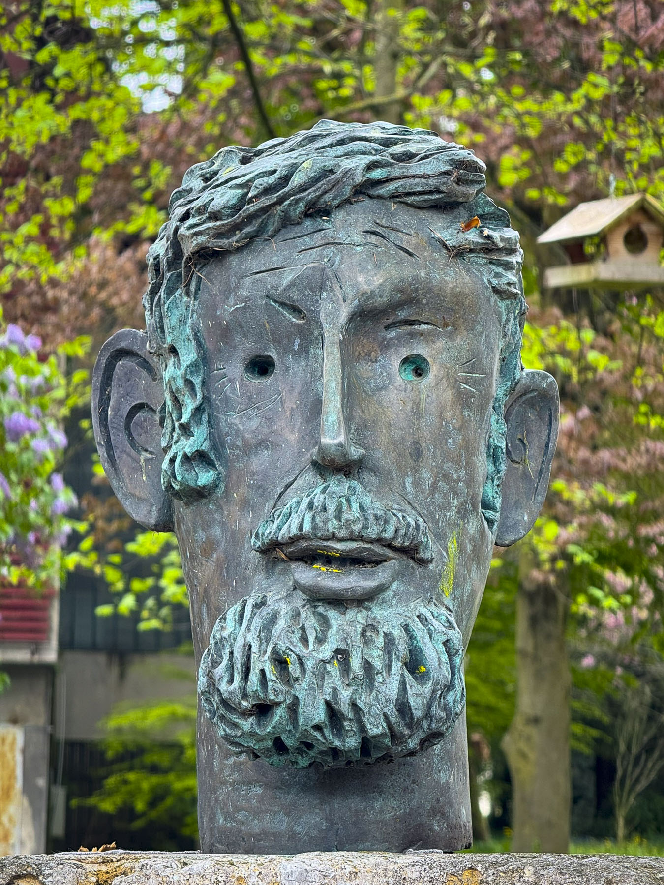In Selška Sora’s new town we had coffee at the Art Café and sat outside on its porch, even though it was a chilly day, to enjoy the ambience of the town. Across the street from the cafe was a small memorial park Aleja zasluženih, the Alley of the Deserving. It featured a row of unique artistic busts portraying influential notable people of the area.