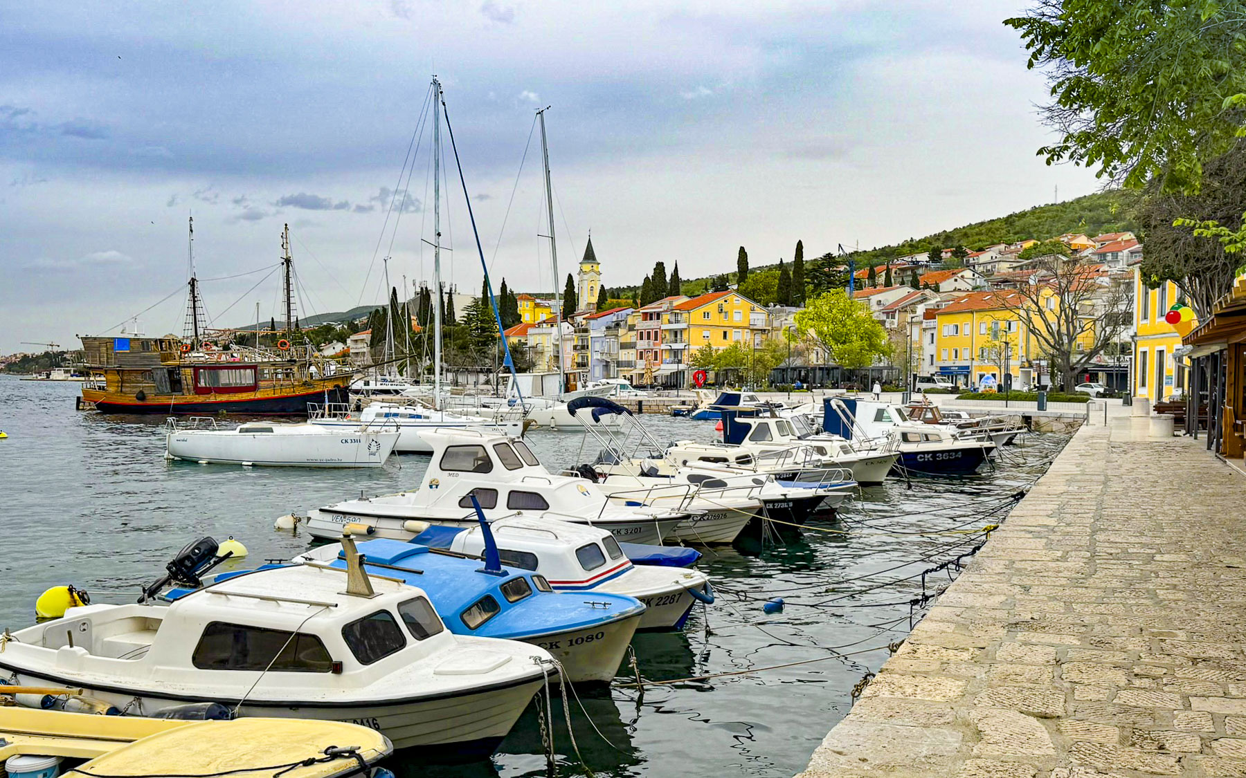 These fiberglass eggs are painted by local artists with themes that reflect the Croatian Christian traditions, and celebrations of Spring. There were numerous restaurants along the quay, but only a few of the smaller cafés were open this time of year. Even though the morning was overcast, the town’s small harbor was a colorful scene of boats and waterfront buildings.