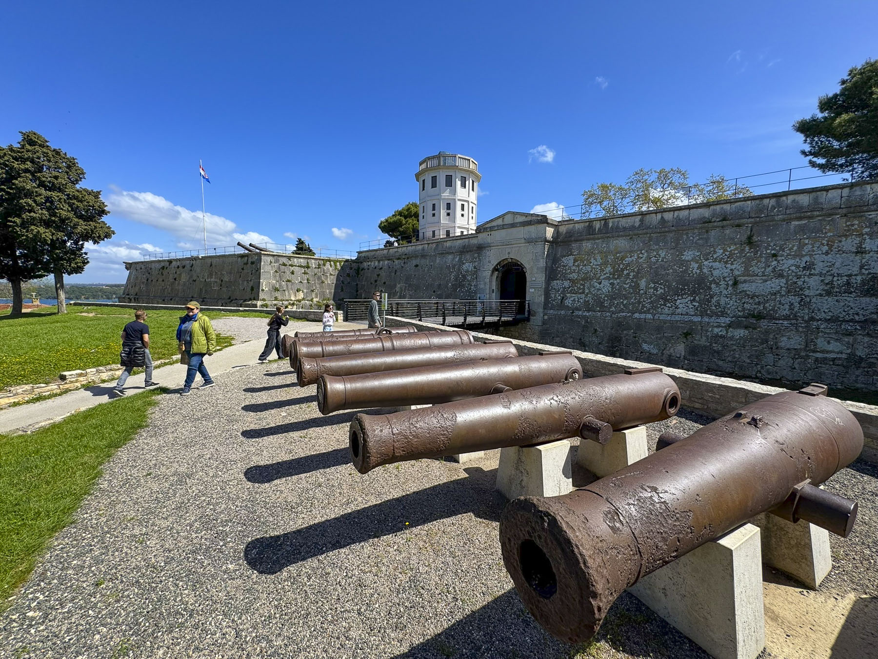 The star shaped bastion was built by the Venetian Empire in the 1500s over the ruins of an earlier Roman fortress and partially used some of the stones from the old colosseum in its construction. It has a commanding view of the harbor and the town surrounding it, and was actively used as military installation by the Austrians during WWI, who built an extensive network of tunnels under the castle known as the Zerostrasse. The tunnels were later expanded upon by the Italians during WWII, and later still, by Yugoslavia’s communist regime, to shelter 50,000 people. Unfortunately, the tunnels were closed when we visited Pula. Near the Zerostrasse’s entrance, at the bottom of the hill behind the Kaštel, there are also the ruins of a small Roman era amphitheater and museum with historical artifacts from the period. The Gate of Hercules and remnants of Pula’s ancient defensive wall are nearby.