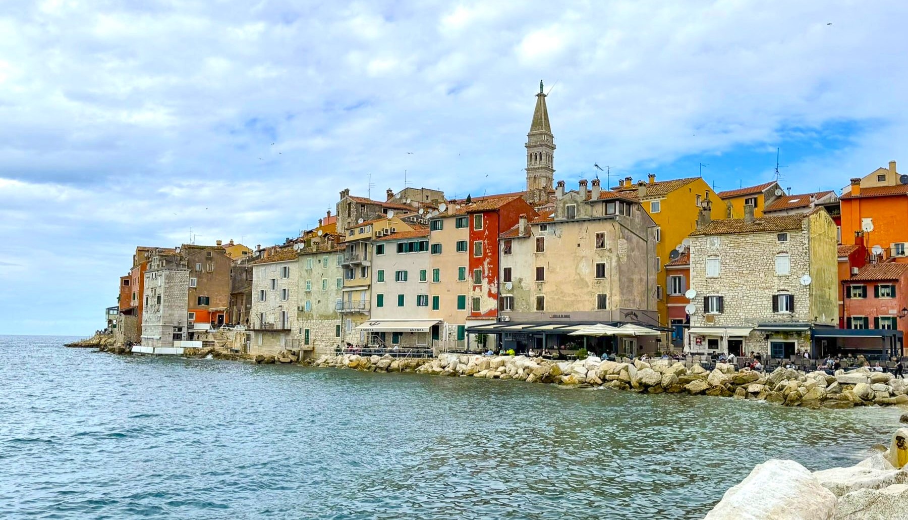 The attraction of Rovinj is its beautiful location on a small headland, that juts out into the northern Adriatic Sea, every square foot of which is covered with picturesque buildings which cascade down to the water’s very edge. The iconic picture of this 16th century merchant and fishing town is taken from the sea and captures the town, centered with the belltower of St. Euphemia’s Church at its apex, as if it was an island floating effortlessly on a horizon that seamlessly merges the sea and sky. The town was in fact an island until it the channel separating it from the mainland was filled in 1763, when the town was part of the Austrian Empire.