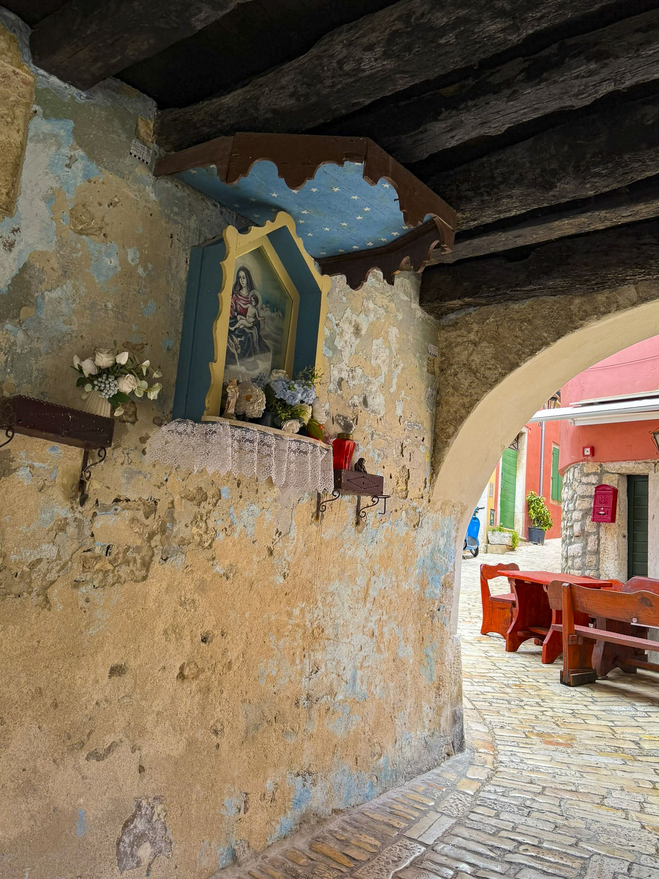 Like Pula, parking in Rovinj was limited and the large municipal lot, on the quay nearest to the old town, filled up quickly, even during the shoulder season. Fortunately, we found a parking lot on Vijenac braće Lorenzetto, a little farther away. From there it was a steep uphill walk until we reached Crkva sv. Franje, the Church of St. Francis, and its Franciscan Monastery which date from the early 1700s.