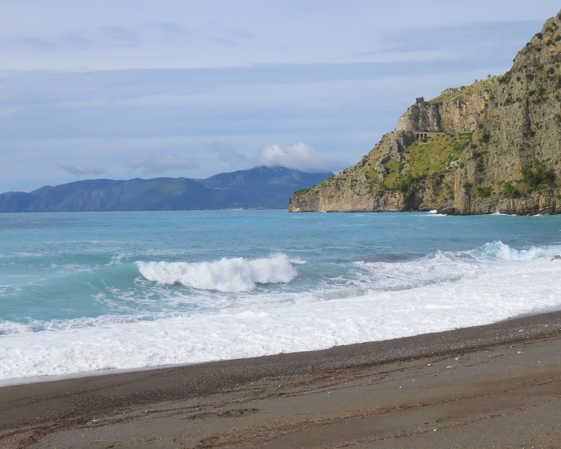 Fortunately, Donna spotted the traffic light that dictated the direction of traffic flow through the narrow passage before an oncoming bus would have forced us to back down the lane. We had a little difficulty finding La Giarauntil we realized it was down at the end of a rutted farm lane more suitable for a tractor than a sedan. Run by a gracious older couple who patiently dealt with our rudimentary Italian, the inn was wonderful, with our upstairs room having a view of the distant sea. We were the only guests. The turquoise waters and the pebbly, black sand beach of Spiaggia Acquafredda were a short walk away from the inn. We had the shoreline to ourselves one crisp morning as we walked along its frothy surf.