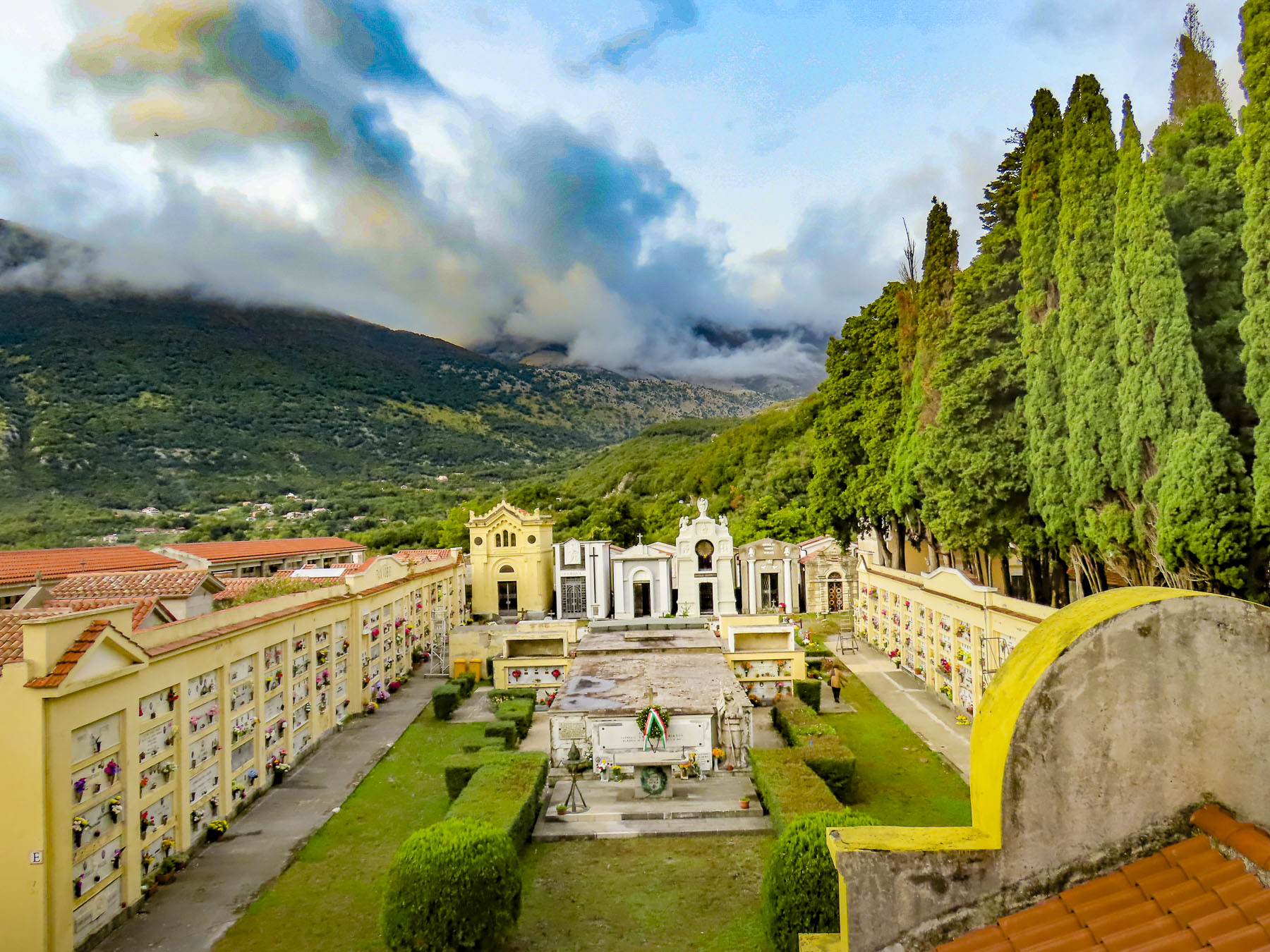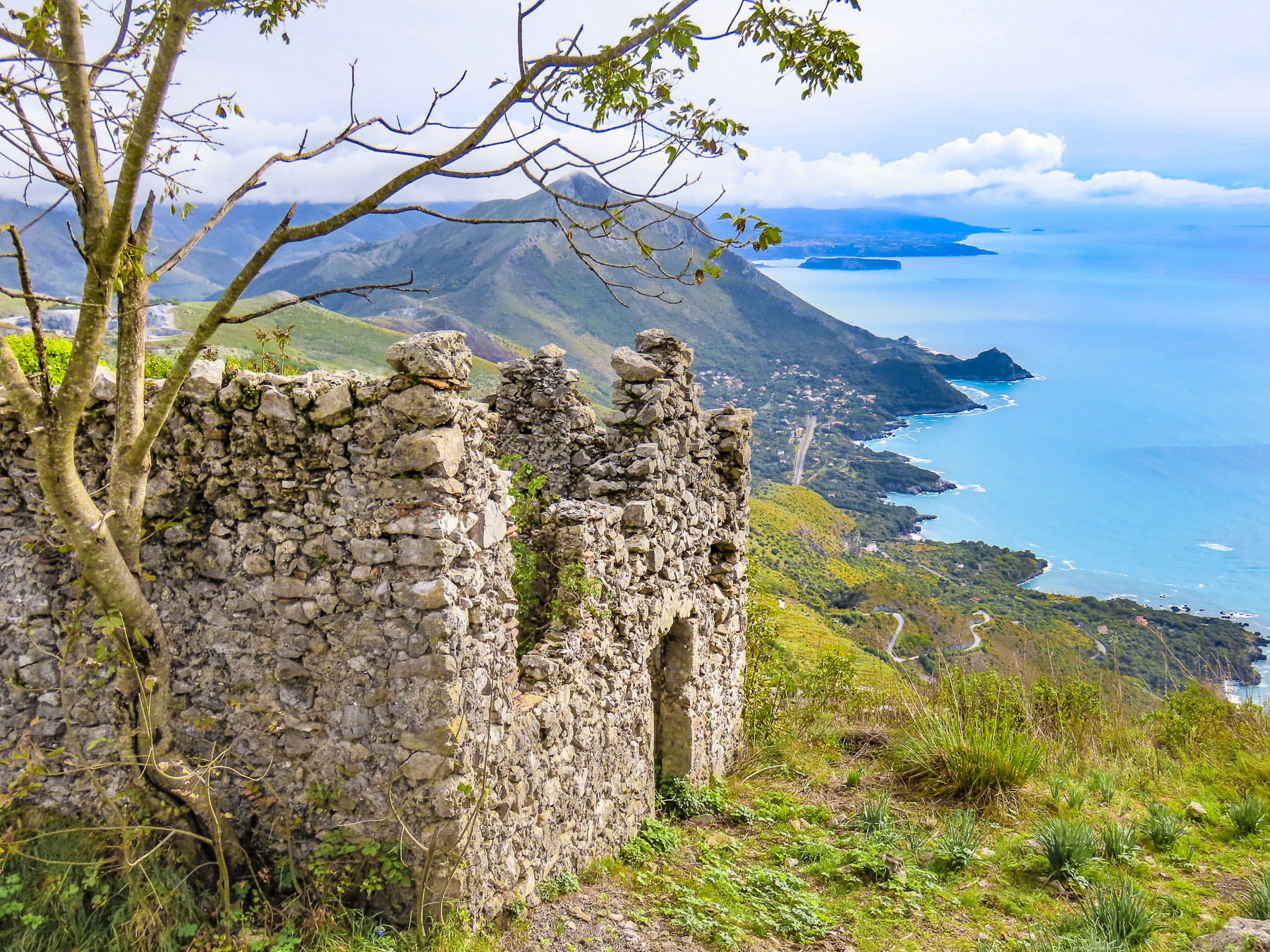 A gentle sloped walkway led to the summit past the stone ruins of old Maratea. Founded by Greeks over two-thousand years ago, they occupied the hilltop for centuries before the lower village was built in the 11th century to accommodate an expanding populace. The landscape around the ruins was dotted with fragrant wild fennel for which Maratea got its name (from the Greek word marathus, wild fennel.) In the mountains behind the church the clouds were almost low enough to cover the tiny Hermitage of Our Lady of the Olive Trees that sits isolated in the rugged terrain.