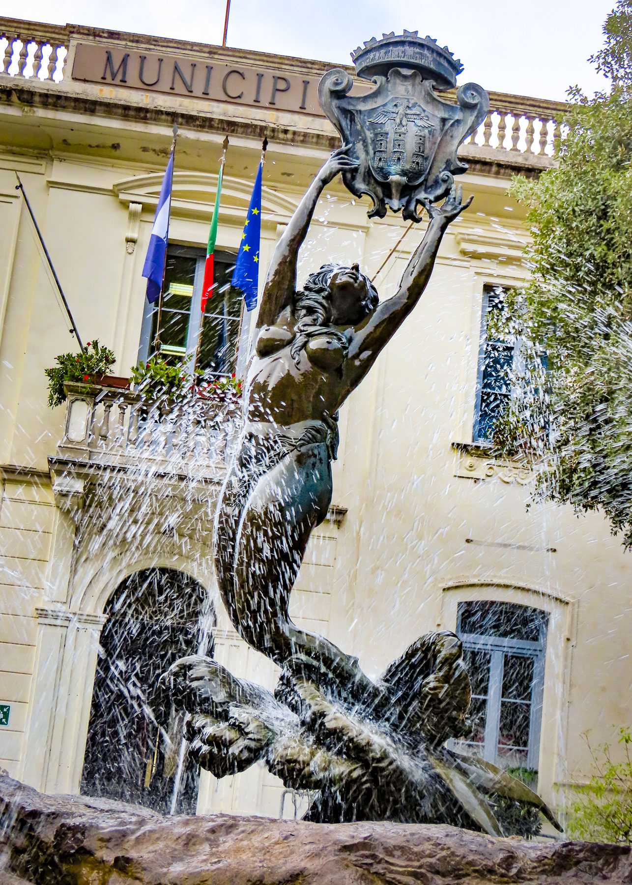 With the port as our destination for lunch, it was a pleasant stroll along near empty sidewalks to Chiostro di San Francesco, a 14th century convent with a lush, greenery-filled cloister that now hosted other activities and concerts. On the top floor Raffaele Celentano’s photography school and gallery had a marvelous patio shaded by the canopy of stately tree. A wooden swing hanging from its branches brought smiles to the faces of many gallery visitors as they playfully took a turn.