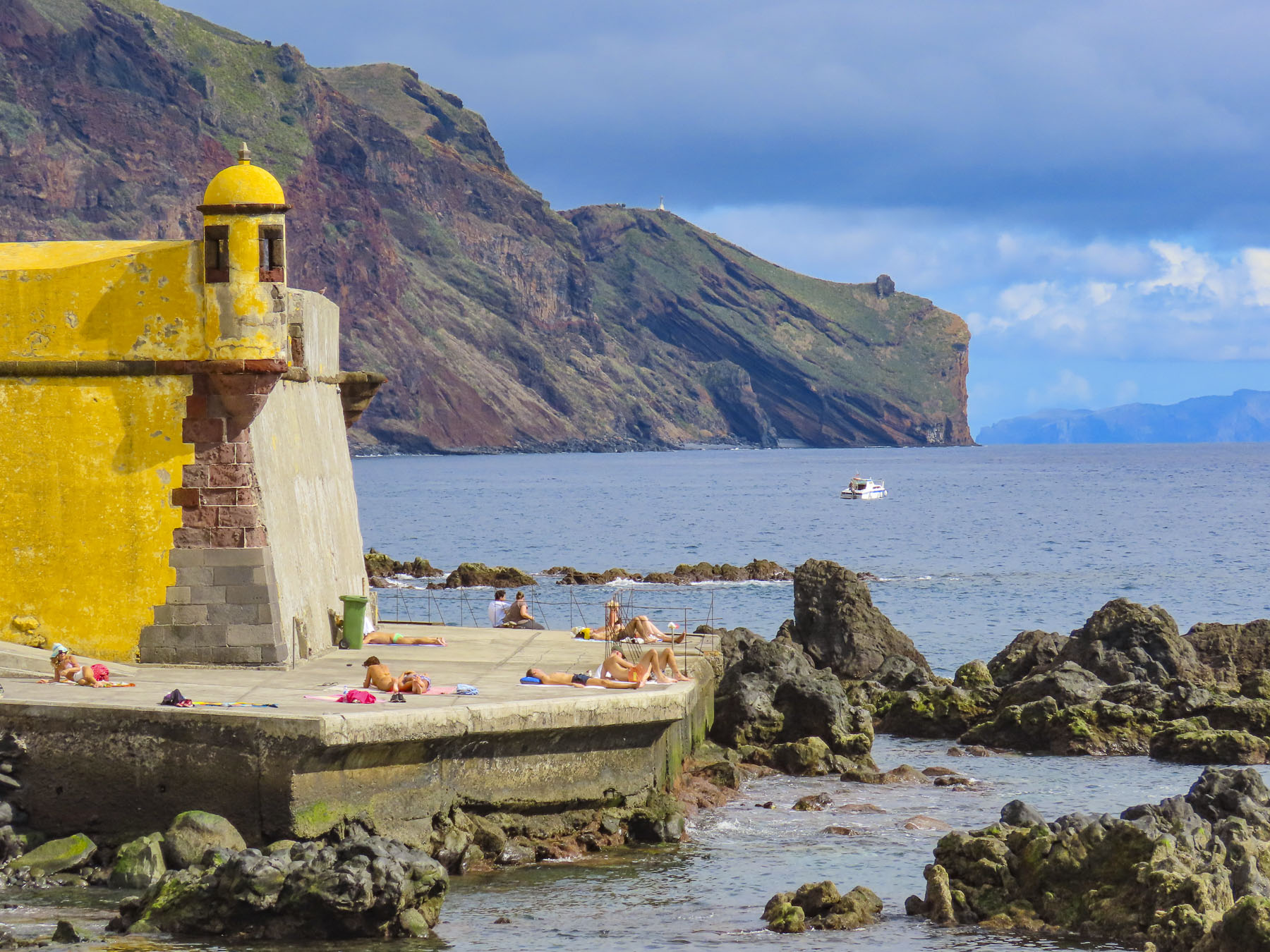 There were numerous interesting photo opportunities from the marina to Forte de São Tiago, which was built in the early 1600s in response to two brutal attacks by pirates. French pirate Bertrand de Montluc assaulted the town in 1566 with three ships. Mayhem ensued as his cut-throats rampaged and plundered the streets for fifteen days. Then Barbary pirates with eight ships ransacked Funchal in 1617 and took 1200 people back to Algiers as slaves. Now, under the ramparts of the fort, pensioners enjoyed ritualistic morning swims along a peaceful, pebbly Praia de São Tiago.