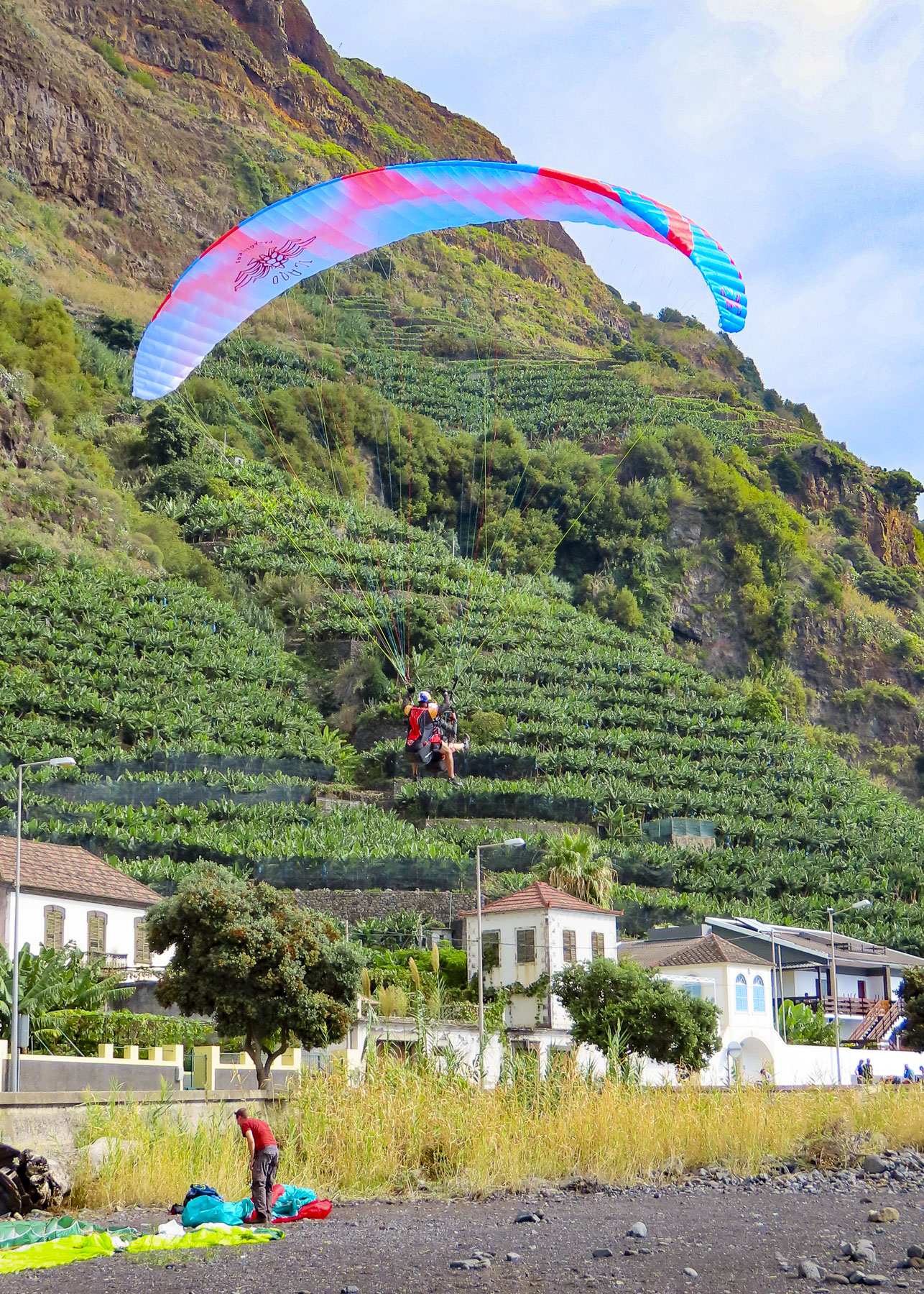 I wasn’t fast enough with my camera to grab a photo of a paraglider swooping low over our car as he landed along the stoney beach at Cais da Fajã do Mar. High above us a group of paragliders swirled on warm thermals and we waited for them to descend, but they kept floating back over the ridge.