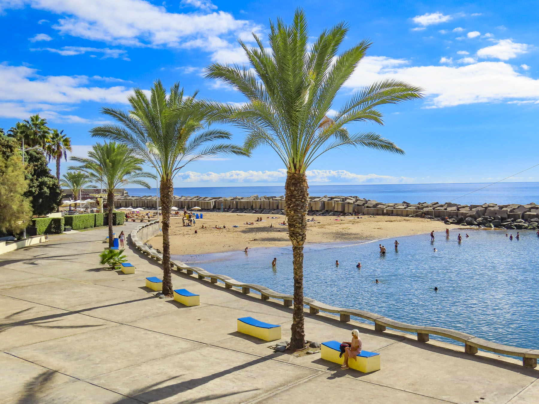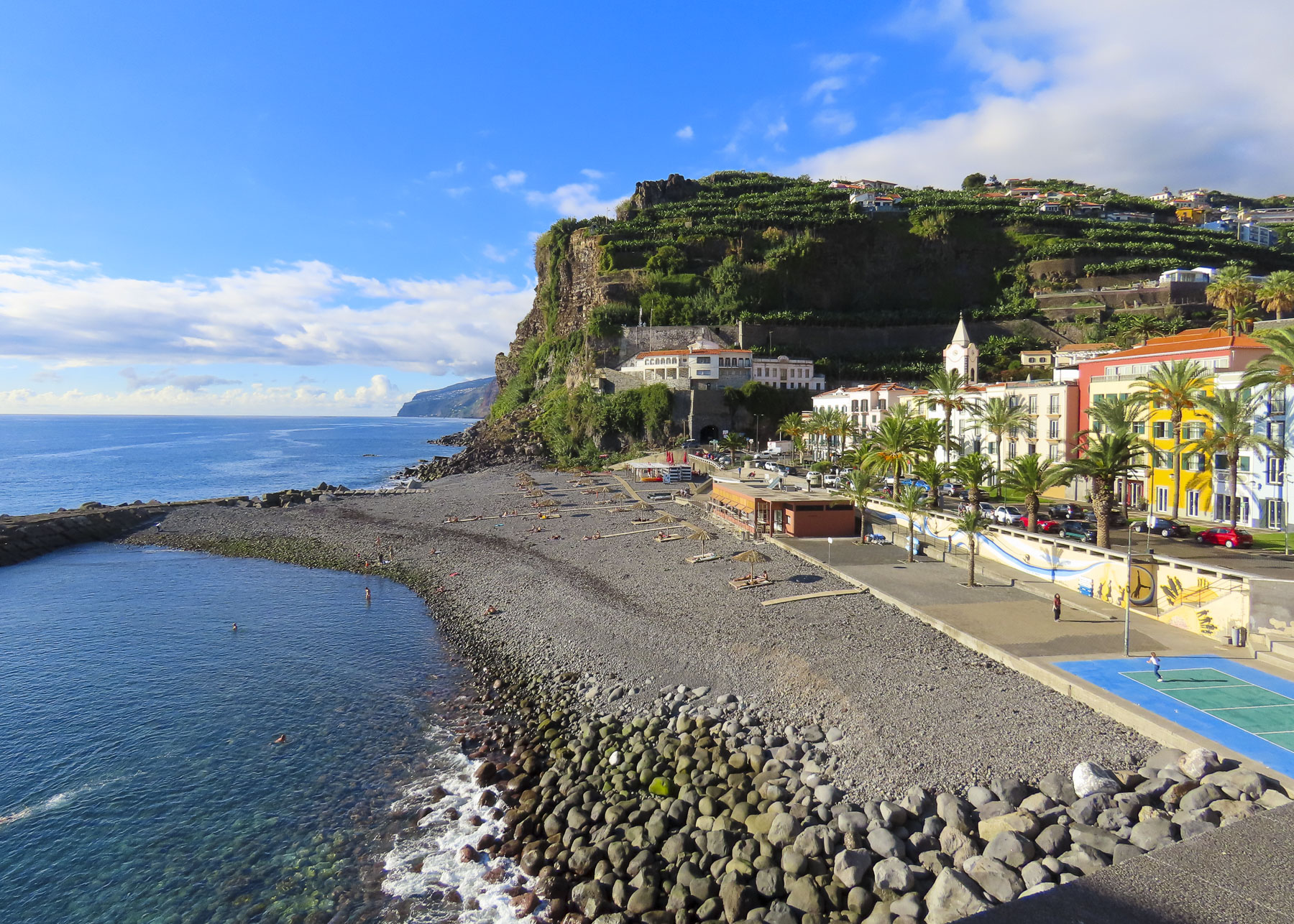 We meandered farther west to the beach and harbor, dramatically wedged between ocean and mountain, in Estreito da Calheta. This is a largely human-altered section of the coast with a breakwater protecting Praia da Calheta, created with imported sand, and harbor next to it. We ate lunch on the promenade across from the marina.