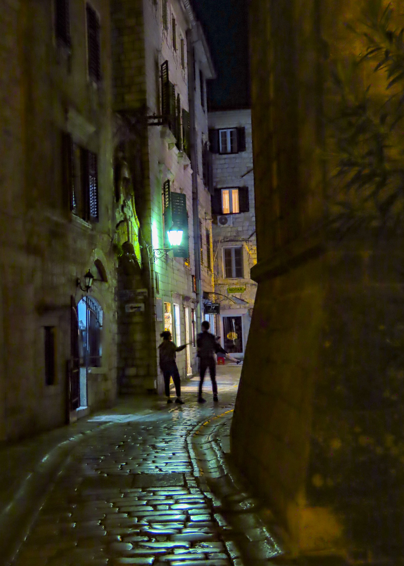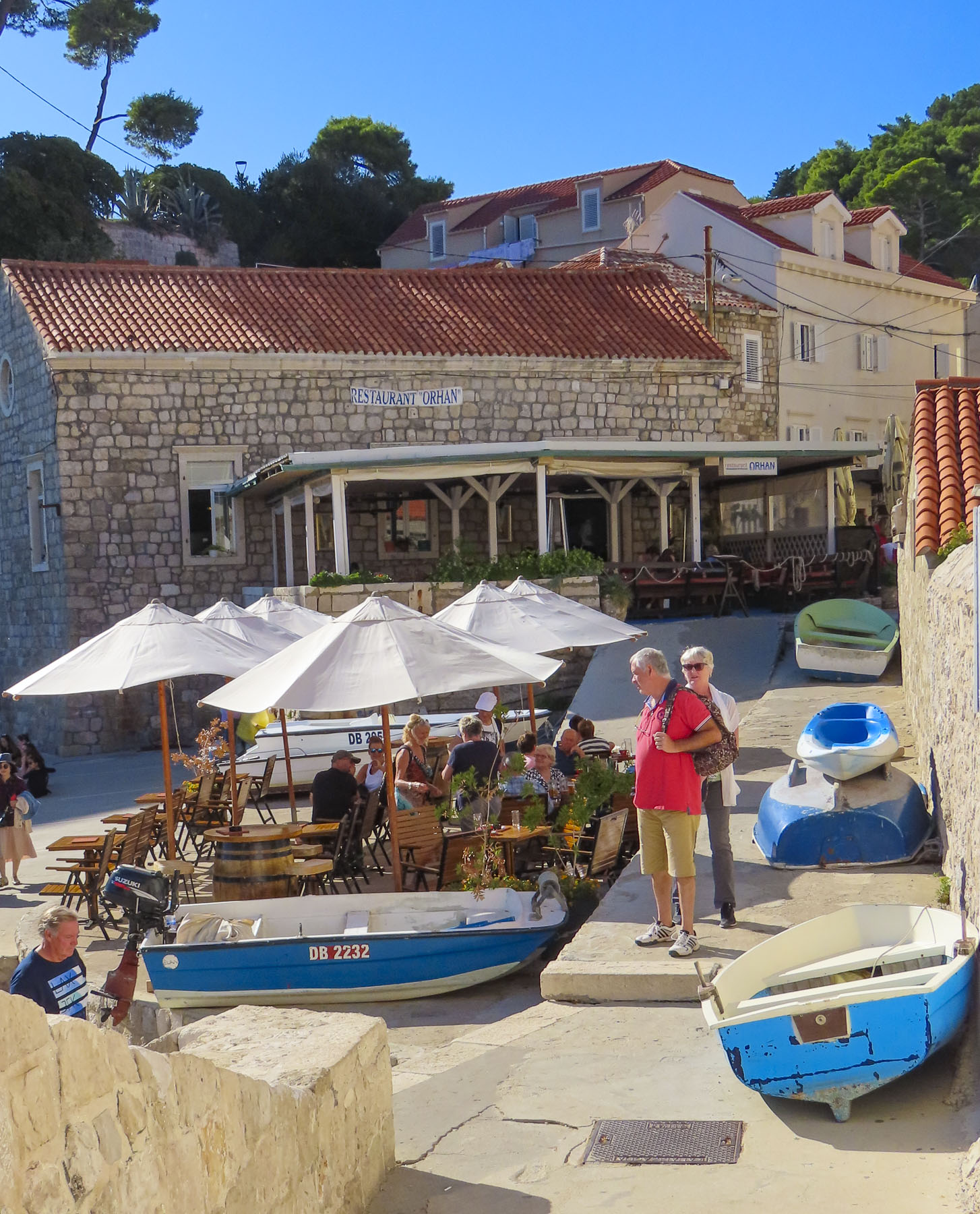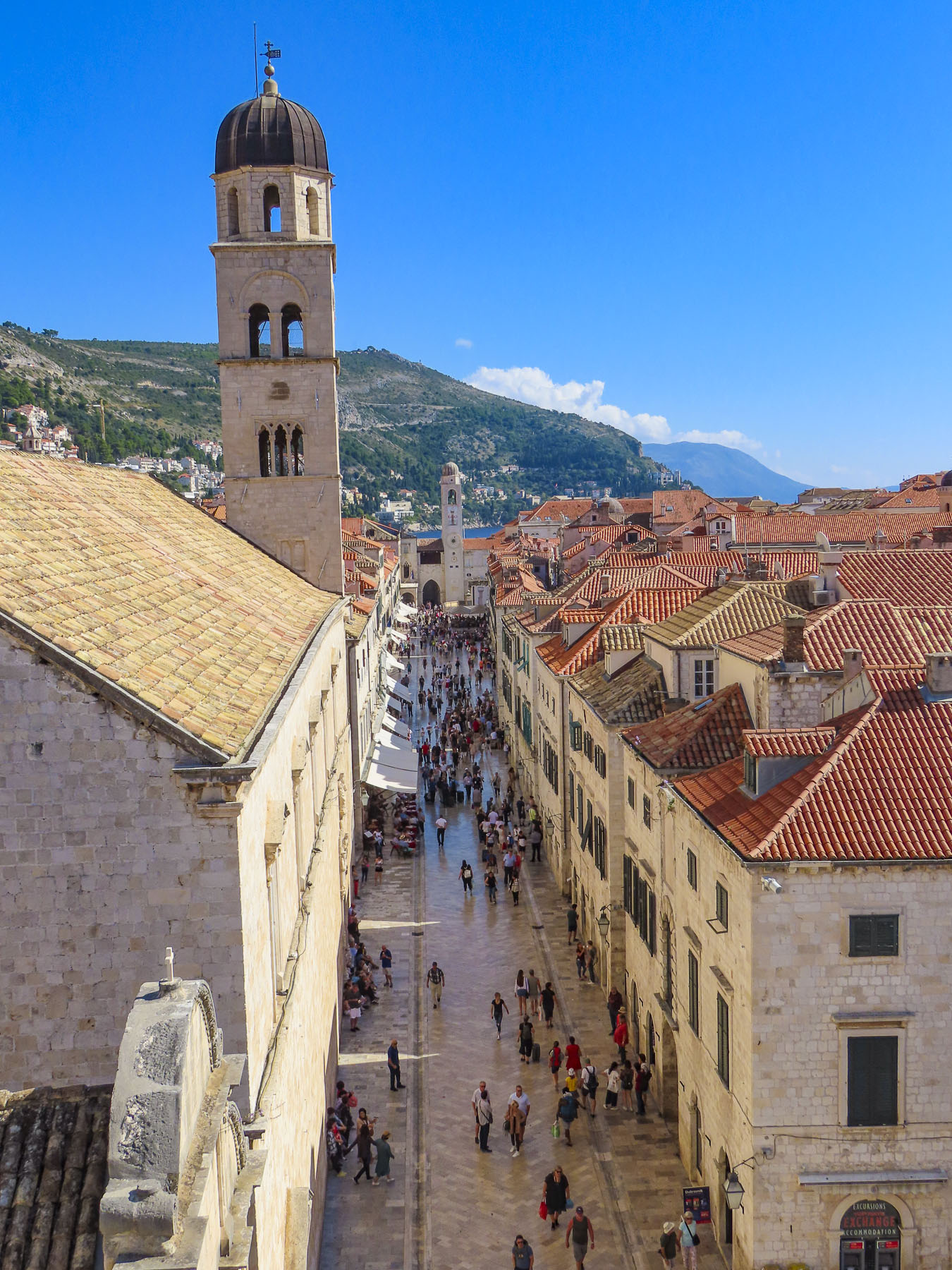 Stradum, aka Placa (Stradone or Corso) is the city’s pedestrian-only main boulevard, running 300 yards east to west, connecting both ancient gates and harbors on either side of town. For us it was too pristine. An unfair comment, as this resulted when Dubrovnik was rebuilt after the 1991 Balkans War, when the city was shelled for seven months from the top of the mountain above town. Two hundred eighty civilians and soldiers were killed during that prolonged bombardment. Today an aerial tram takes you there for panoramic views. Shrapnel scars, signs of the conflict, remain etched into the stone walls on some buildings. But the newness of the polished limestone boulevard running past upscale shopping reminded us of an amusement park.