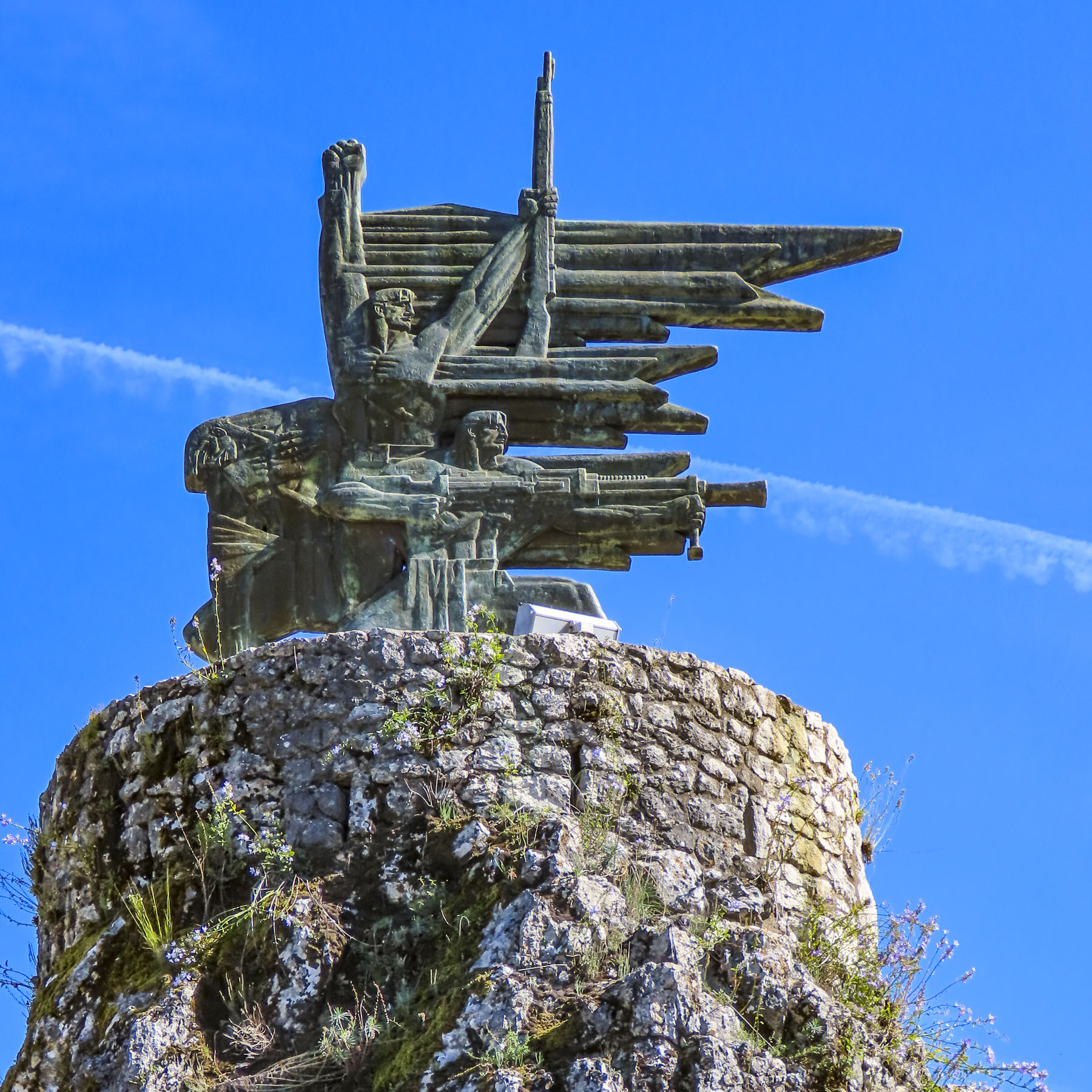 A memorial, Spomen ploča žrtvama komunističkog terora, to victims of the communist terror, stands on a curve in the road. It commemorates the lives of five young Yugoslavian partisans thrown from the cliff to their deaths by communist “liberation forces” loyal to Marshal Tito at the end of WWII.