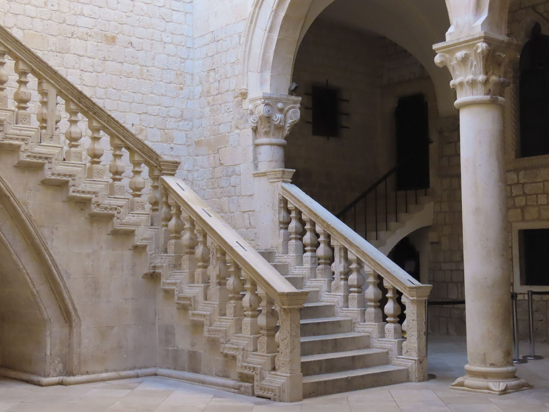 At the far end of Stradum the city’s 100 ft tall clock and belltower zooms skyward over an area that was once the city market in the 1400s. Famously the belltower has two bronze figures named Maro and Baro, zelenci (green) twins that strike the bell on the quarter, half and full hour. Interestingly, several generations of the same family have maintained the clockworks for over 100 years. Next door the 14th-century Gothic-Renaissance style Rector’s Palace exhibits vestiges of Dubrovnik’s history. Especially noteworthy were the intricately carved exterior columns.