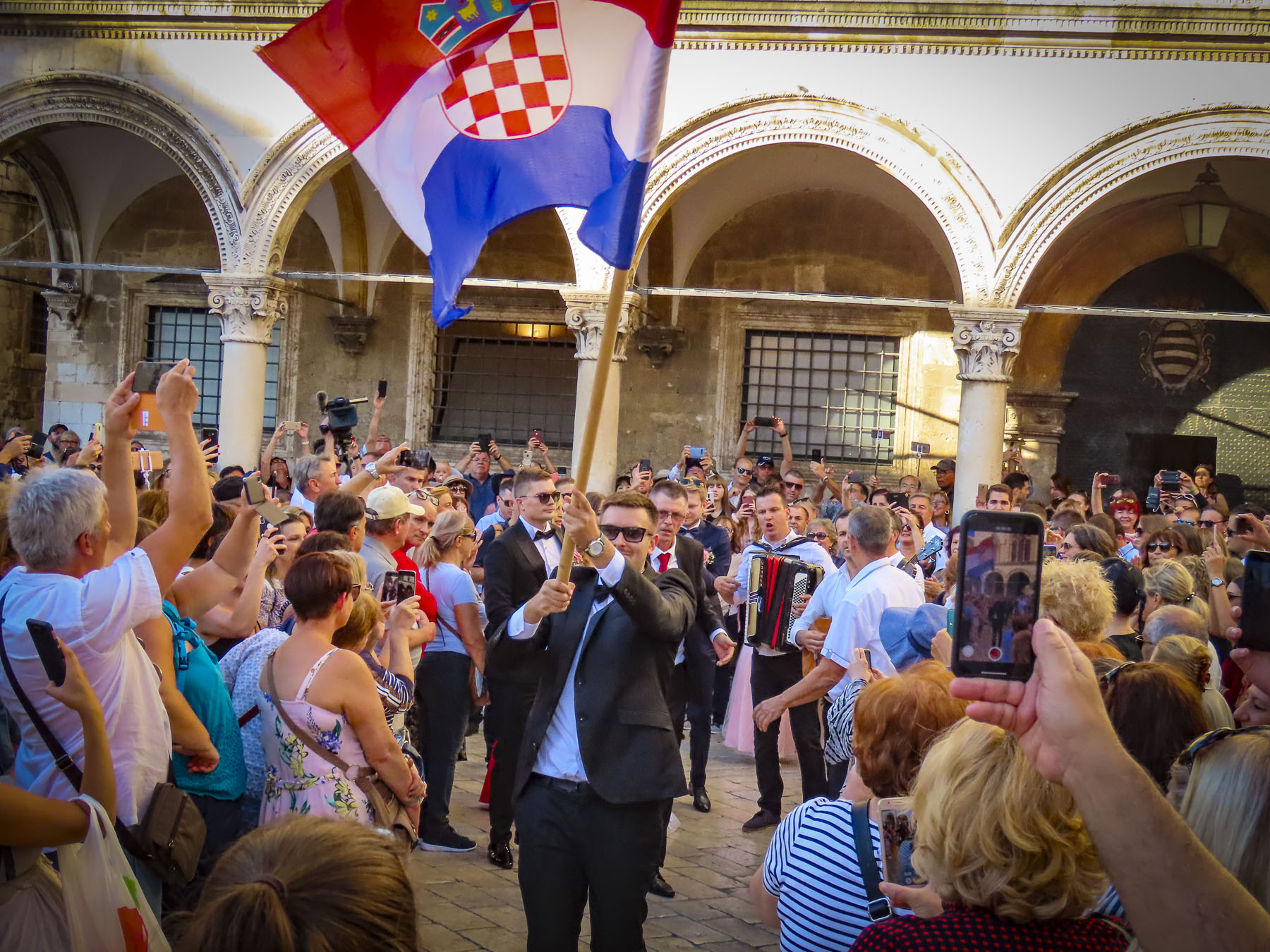 Weddings are a boisterous affair in Dubrovnik, with the bride and groom following a flag waving entourage parading through the pedestrian-only streets on the way to their church ceremony.
