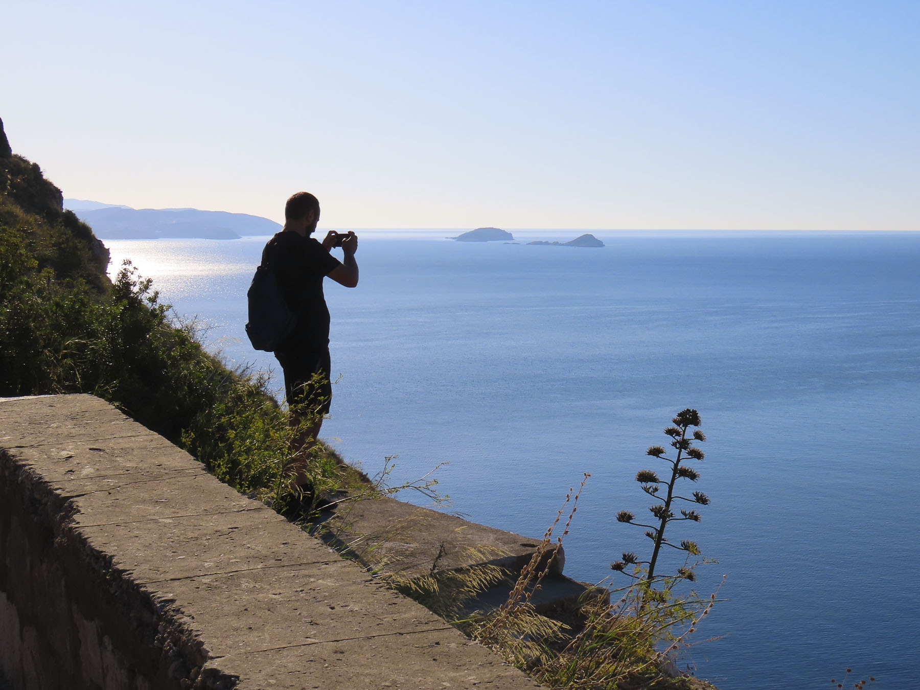 Eventually the road narrowed and a chain across it prevented cars from going farther along a treacherous, serpentine stretch that hugs the cliff face. The road used to connect back to the highway near one of the scenic overlooks. But it was determined to be too dangerous when its guardrails tumbled down the cliff into the sea. Now only walkers and bicyclists use it to traverse a dramatic section of the coast.