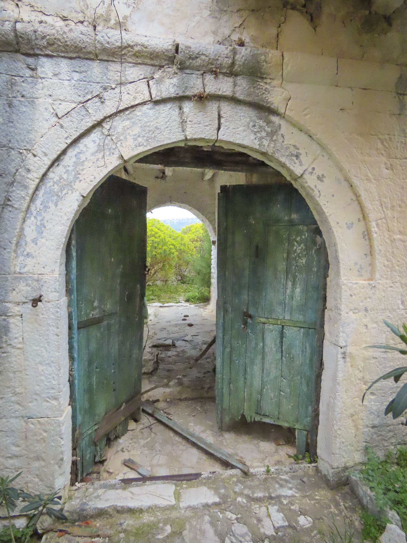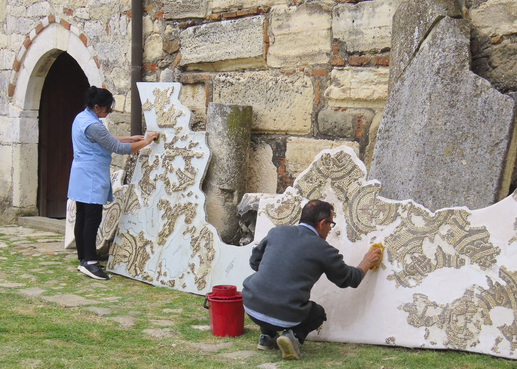 Continuing back to the village we worked our way to the apex of the headland, where the ruins of a 6th century Byzantine church are cordoned off to protect a very large and well preserved intricate floor mosaic from an earlier Roman temple. Signage on the fence details the site and mentioned that the mosaics, which are unprotected from the elements, are currently covered with sand to protect them from further deterioration. The information plaque also mentioned that the mosaics are uncovered twice a year for public viewing and included the phone number of the local caretaker.