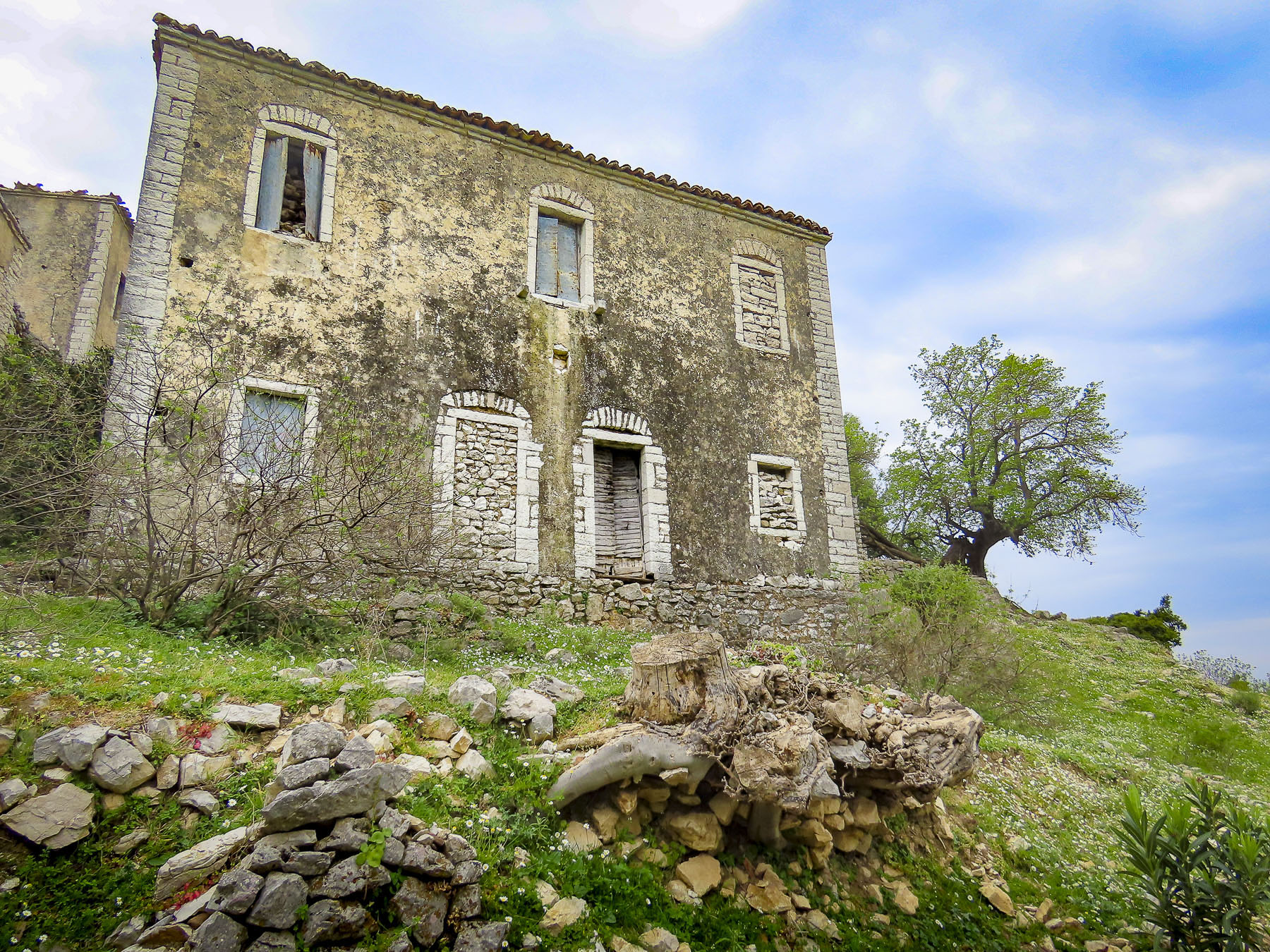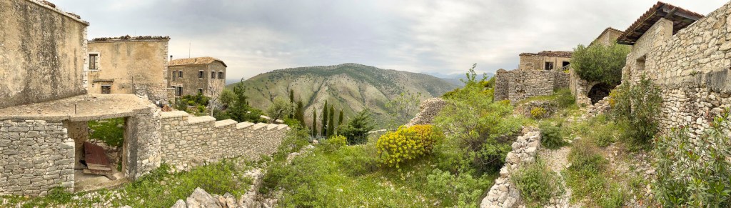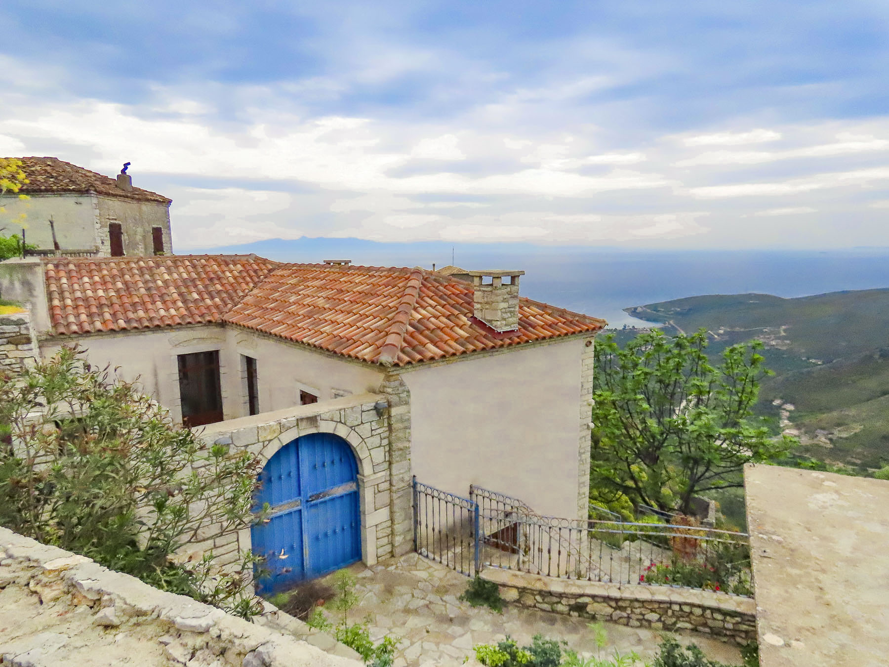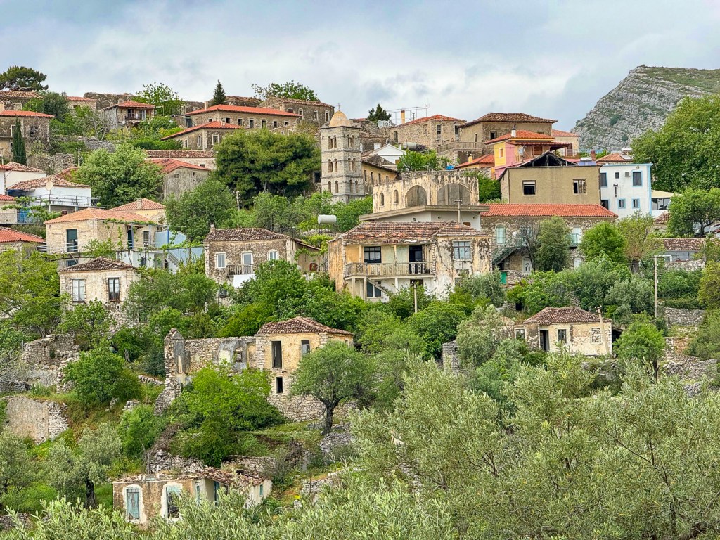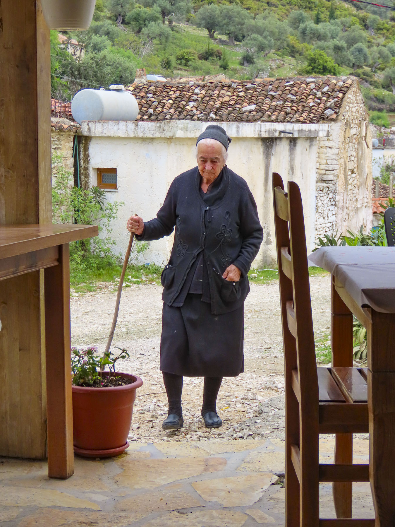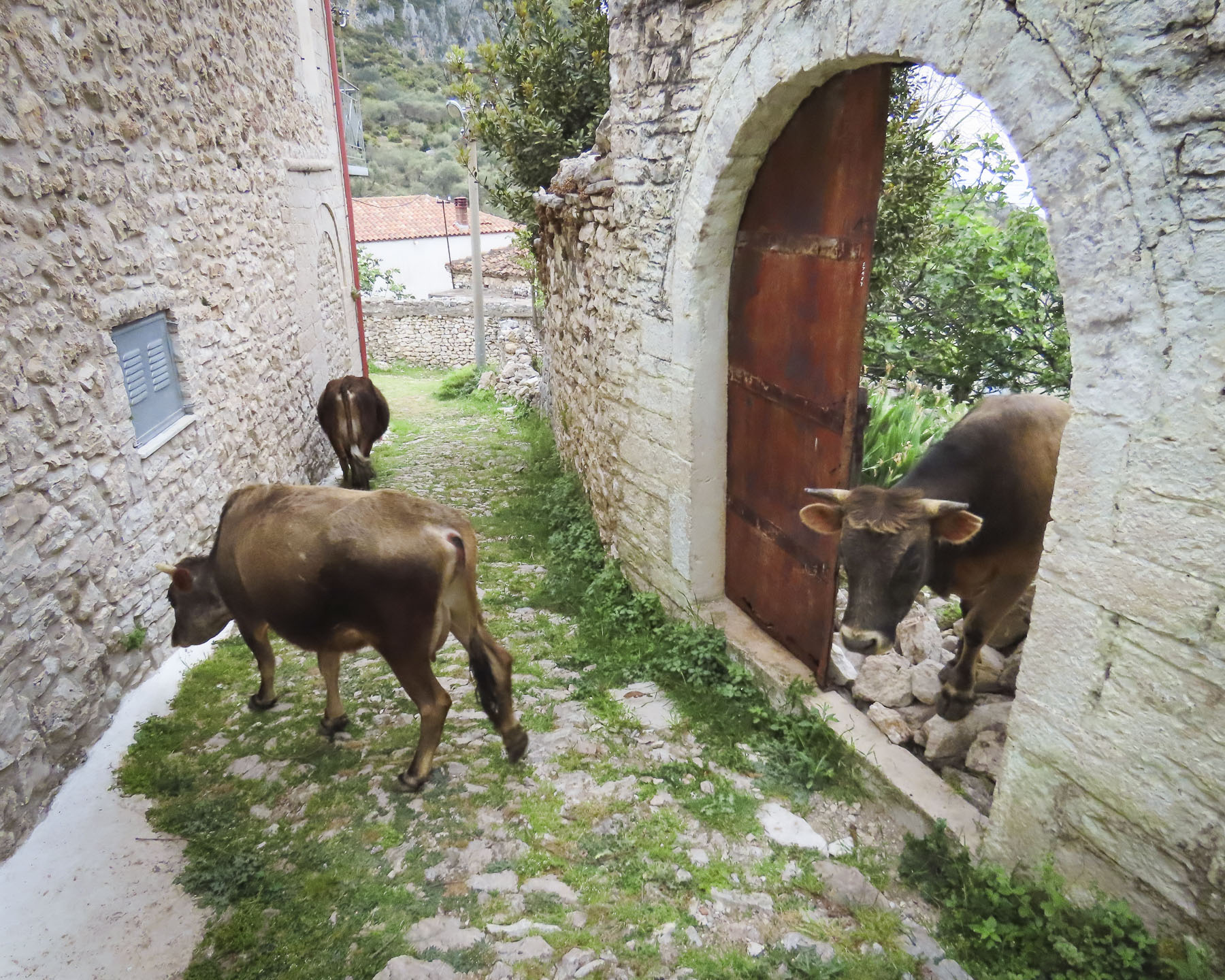 Walking downhill back through the village we stopped to photograph a scene. It was only when we started walking again that I caught some motion in my peripheral vision and saw the freshly slaughtered cow hanging from a sturdy tripod stand, with three villagers attending to it, in front of a store that had a coffee shop sign above its door. They waved. A little farther down the lane, we passed an older woman walking up the hill carry small buckets of milk. She must have been 15 years older than us, but she was a hearty soul and ended up lapping us three times. When we returned to the inn Merita had some freshly baked bread and muffins waiting for us, along with a fig jam, made with the fruit from the tree in the front yard, feta cheese, butter, yogurt, and eggs sourced from various neighbors. We enjoyed our short time in Lin and wished that we had made plans to stay longer.