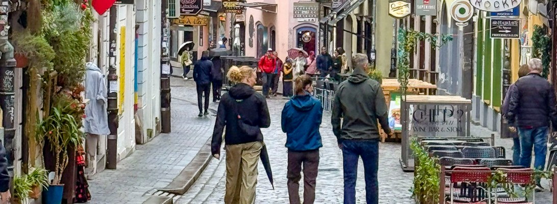 At the far end the tunnel opened to Ul. Pavla Radića, a charming, historic cobblestone lane that was for centuries the primary connection between the lower and upper towns. Today it’s lined with shops, cafes and galleries as it runs downhill to Trg bana Josipa Jelačića, Zagreb’s central square or uphill, the direction we were going, to Kamenita Vrata, Gornji Grad’s old stone gate. An equestrian statue of Saint George guarded the entrance to the Upper Town, across from pastel toned buildings, which were a nice change from the ubiquitous sandstone facades.